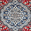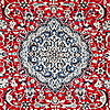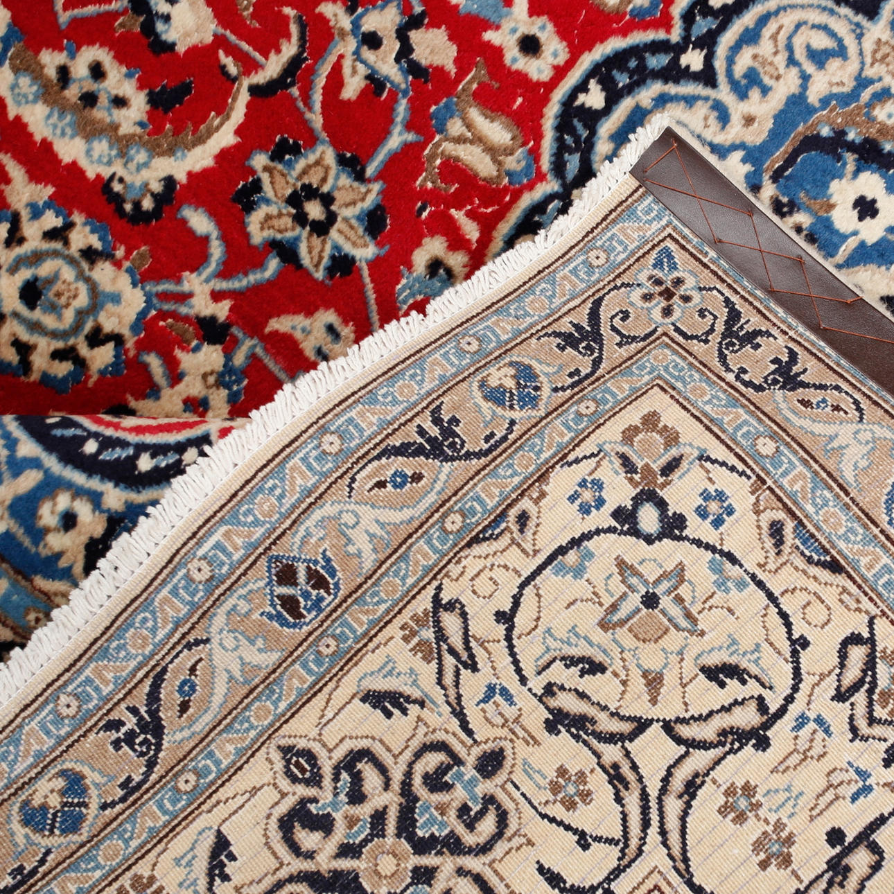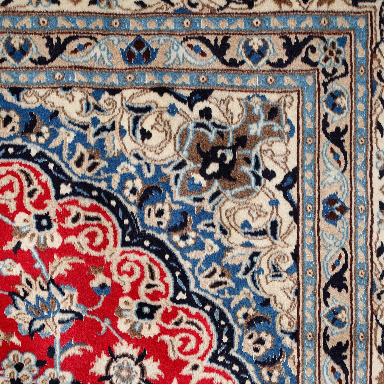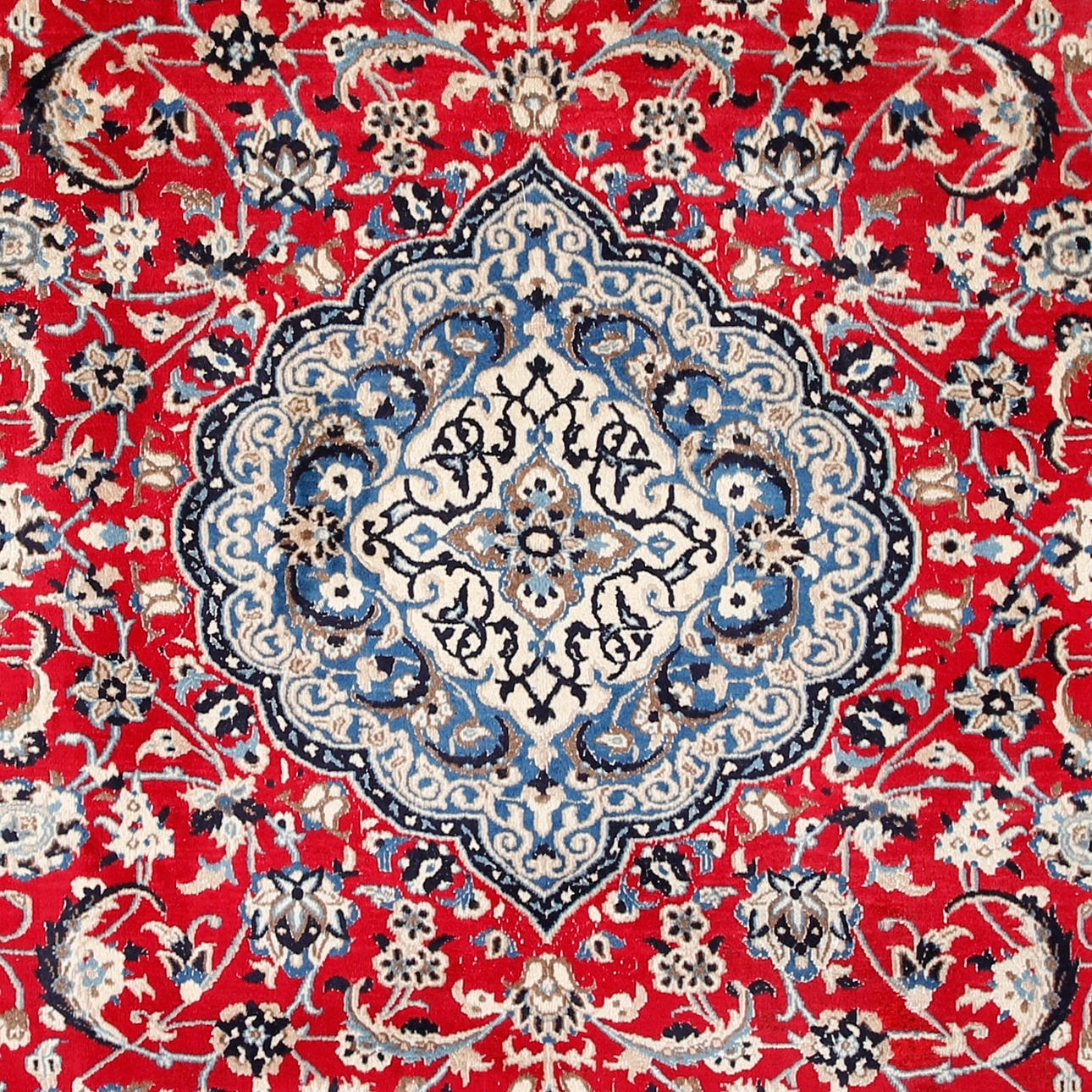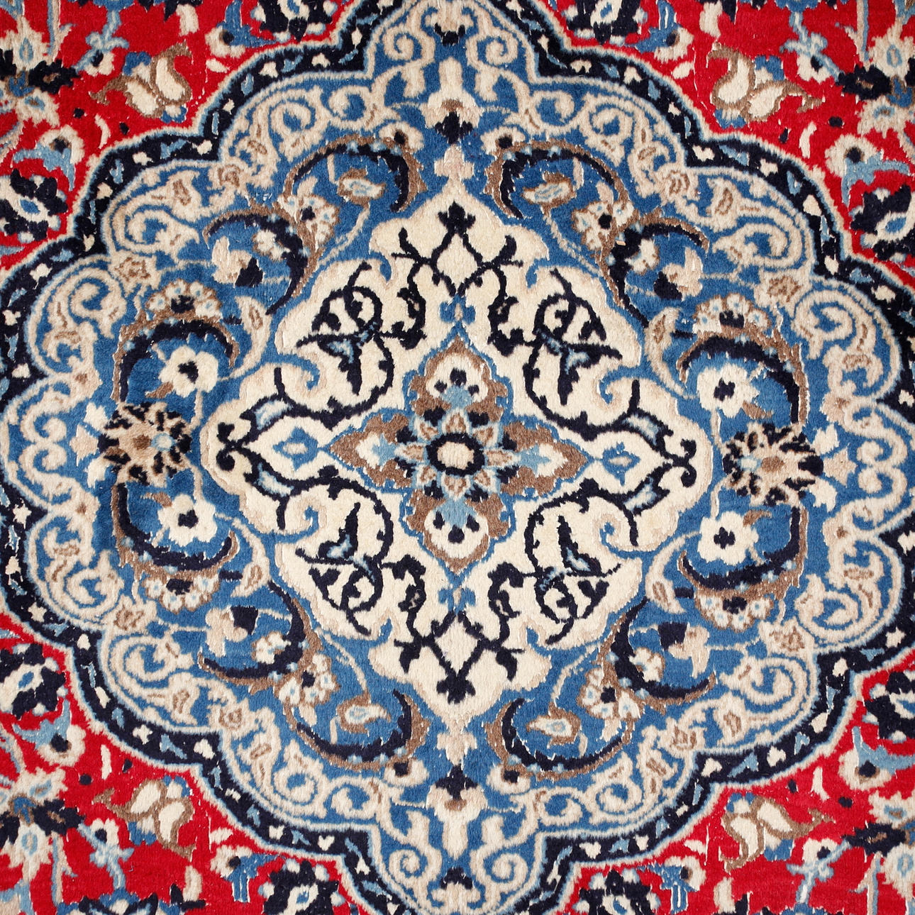 Handknuten persisk matta i ull på bomullsvarp, Nain. Rund medaljong och huvudbård i ljus färgställning, på övermönstrad ljusröd botten.