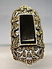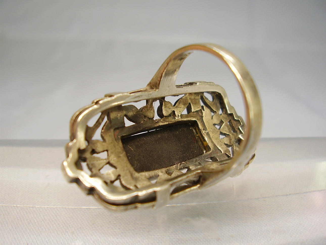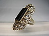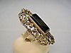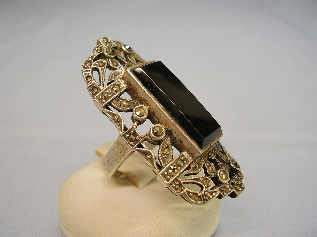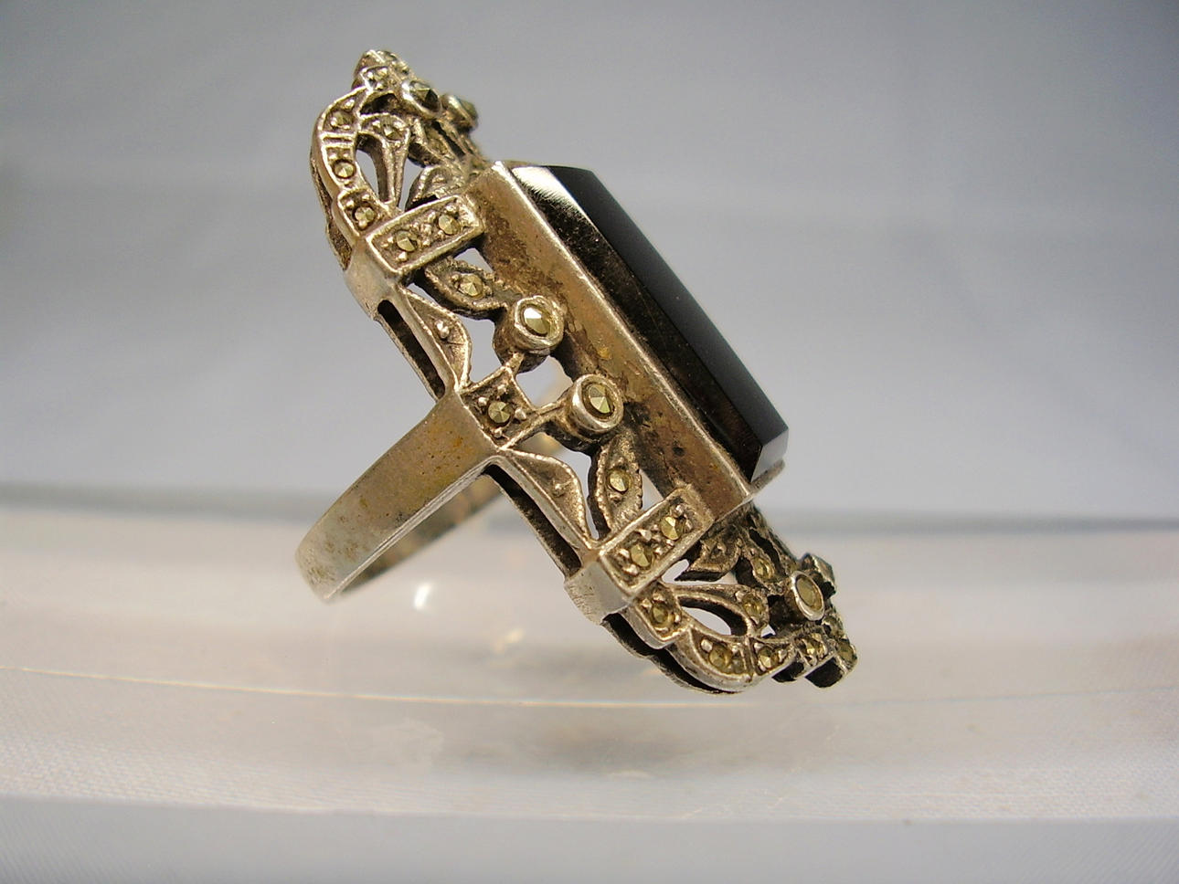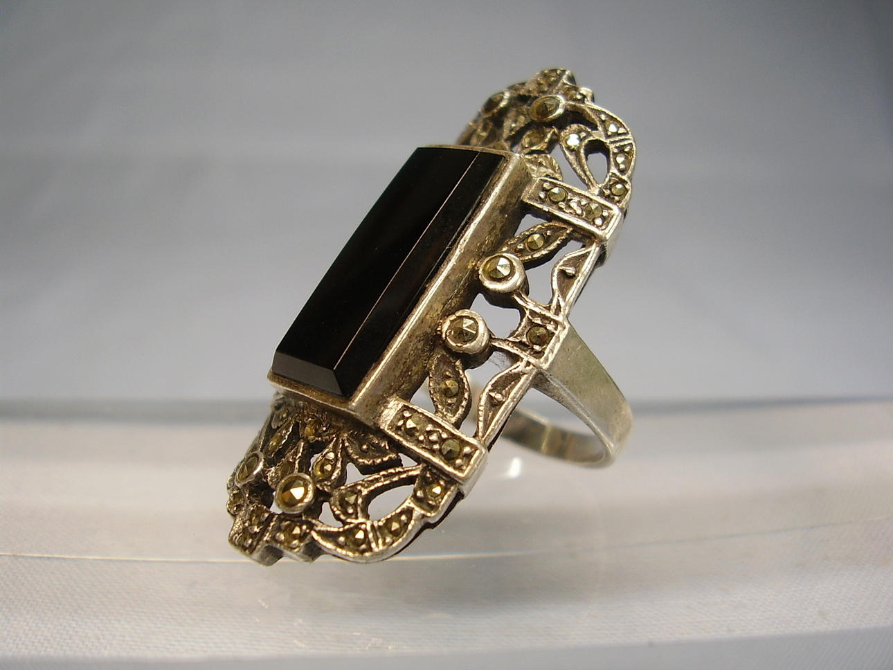 Den har ett stort, öppet ringhuvud, som är satt med en svart rektangulär fasetterad onyxplatta och små markasiter.