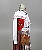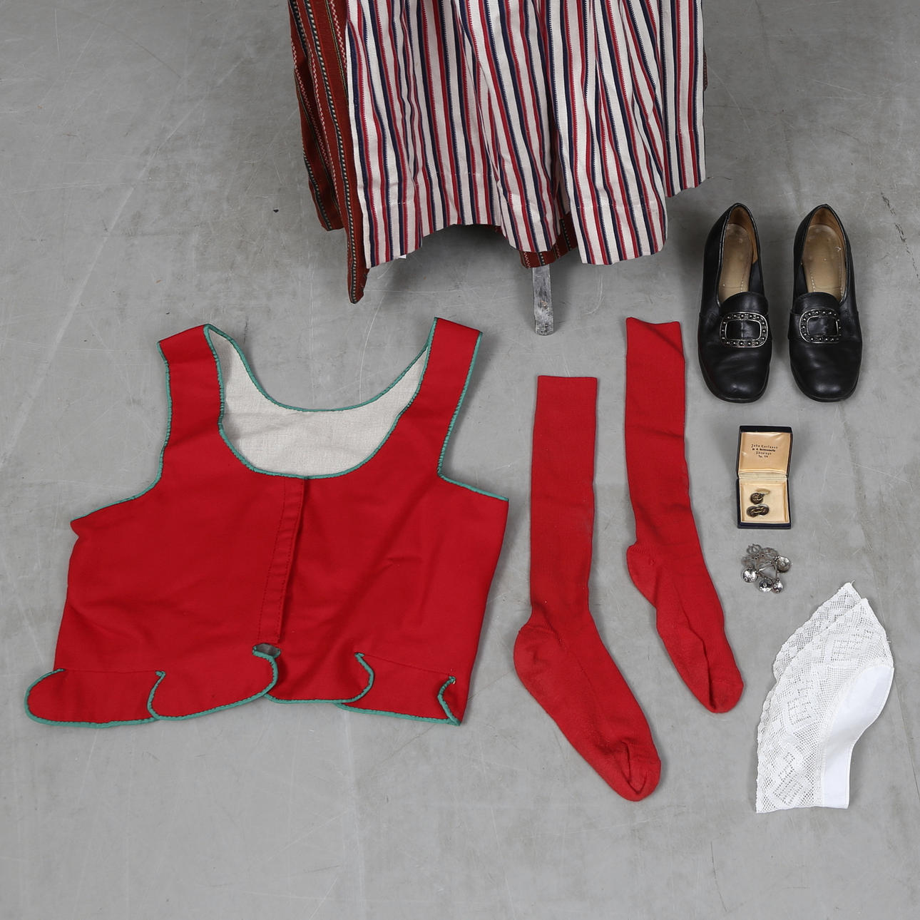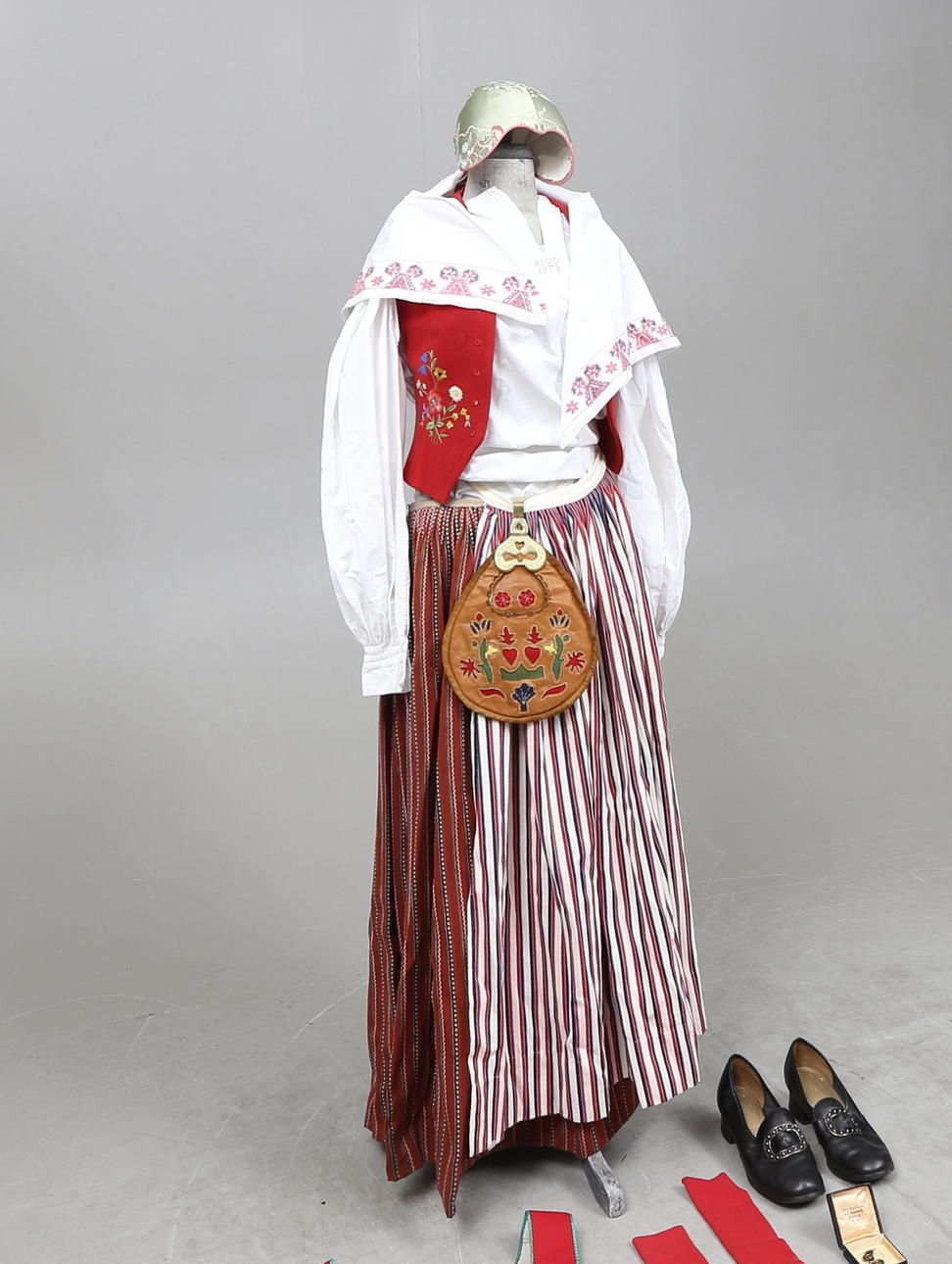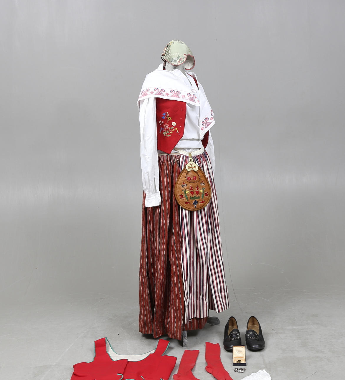 Västar, 2 delar. Hätta, ett par skor, förkläde, skjorta, scarf, kjol, ett par strumpor, väska, ett par manschettknappar, dräktbrosch.