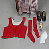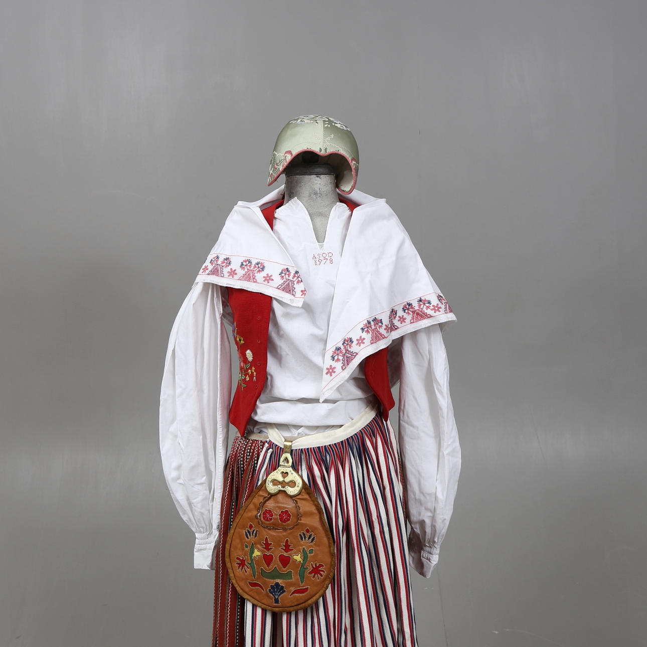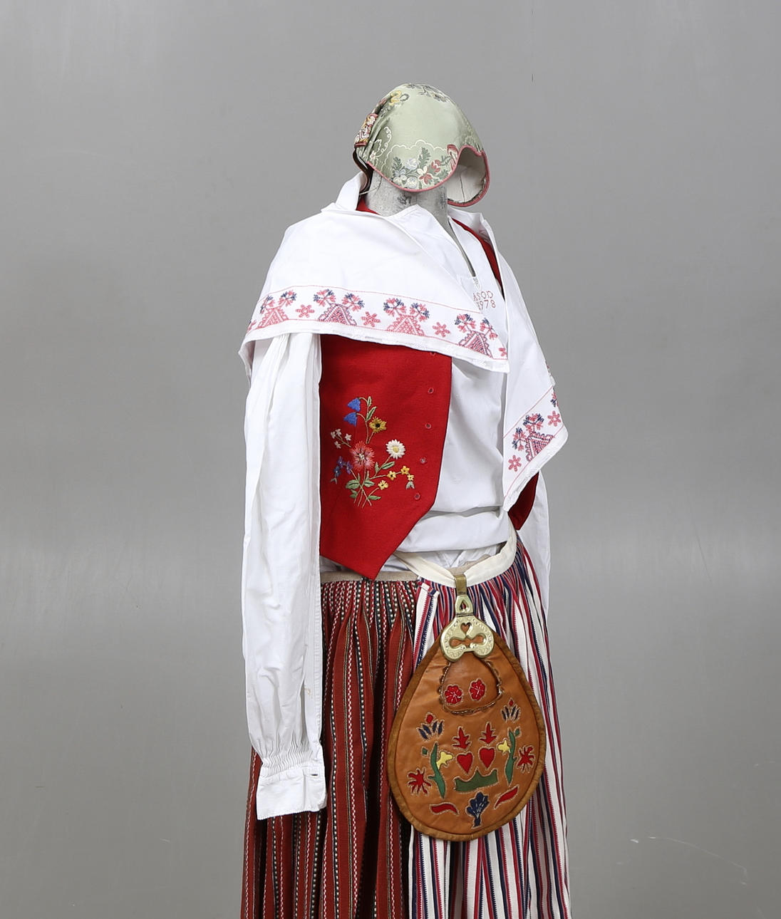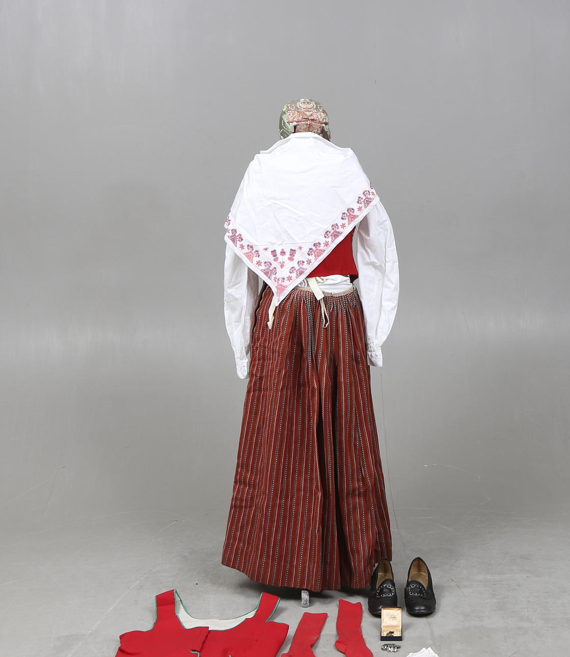 Västar, 2 delar. Hätta, ett par skor, förkläde, skjorta, scarf, kjol, ett par strumpor, väska, ett par manschettknappar, dräktbrosch.