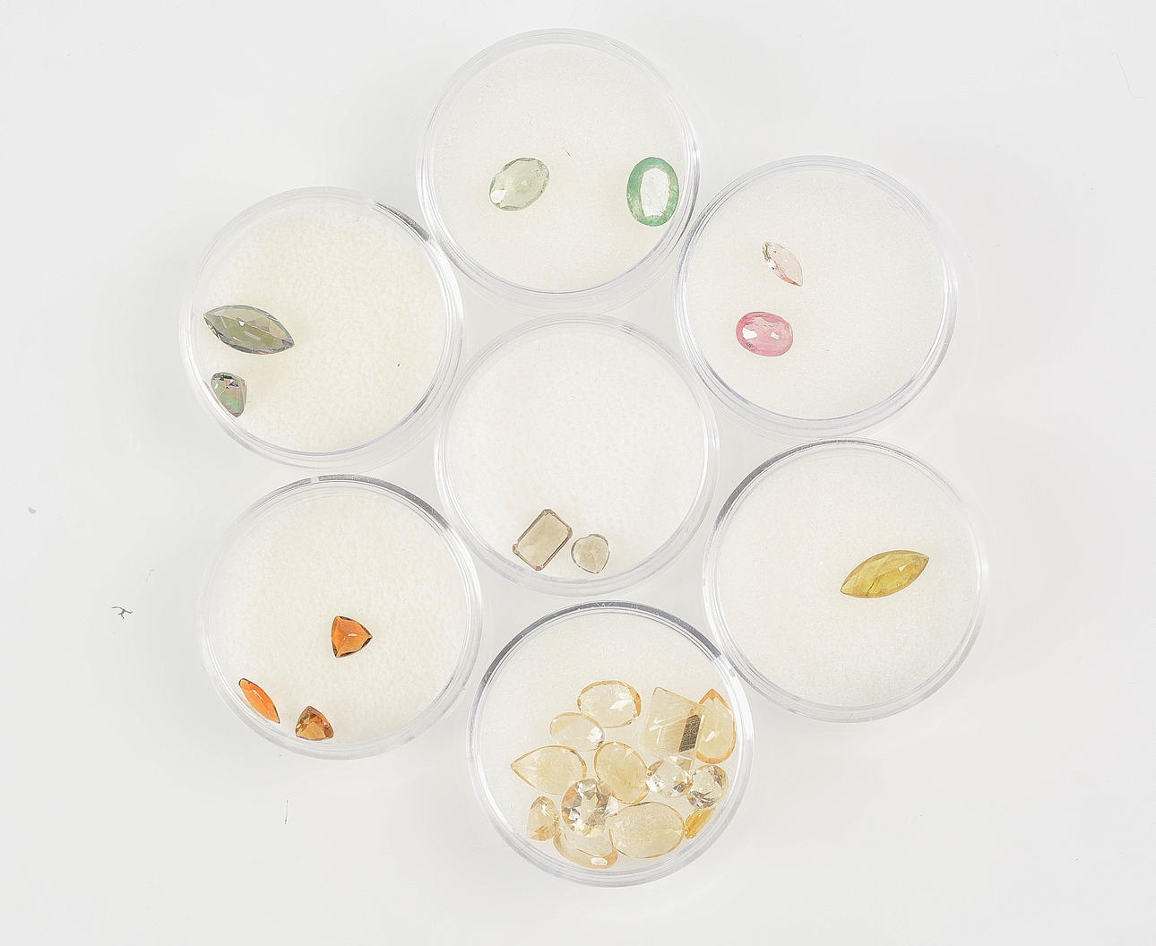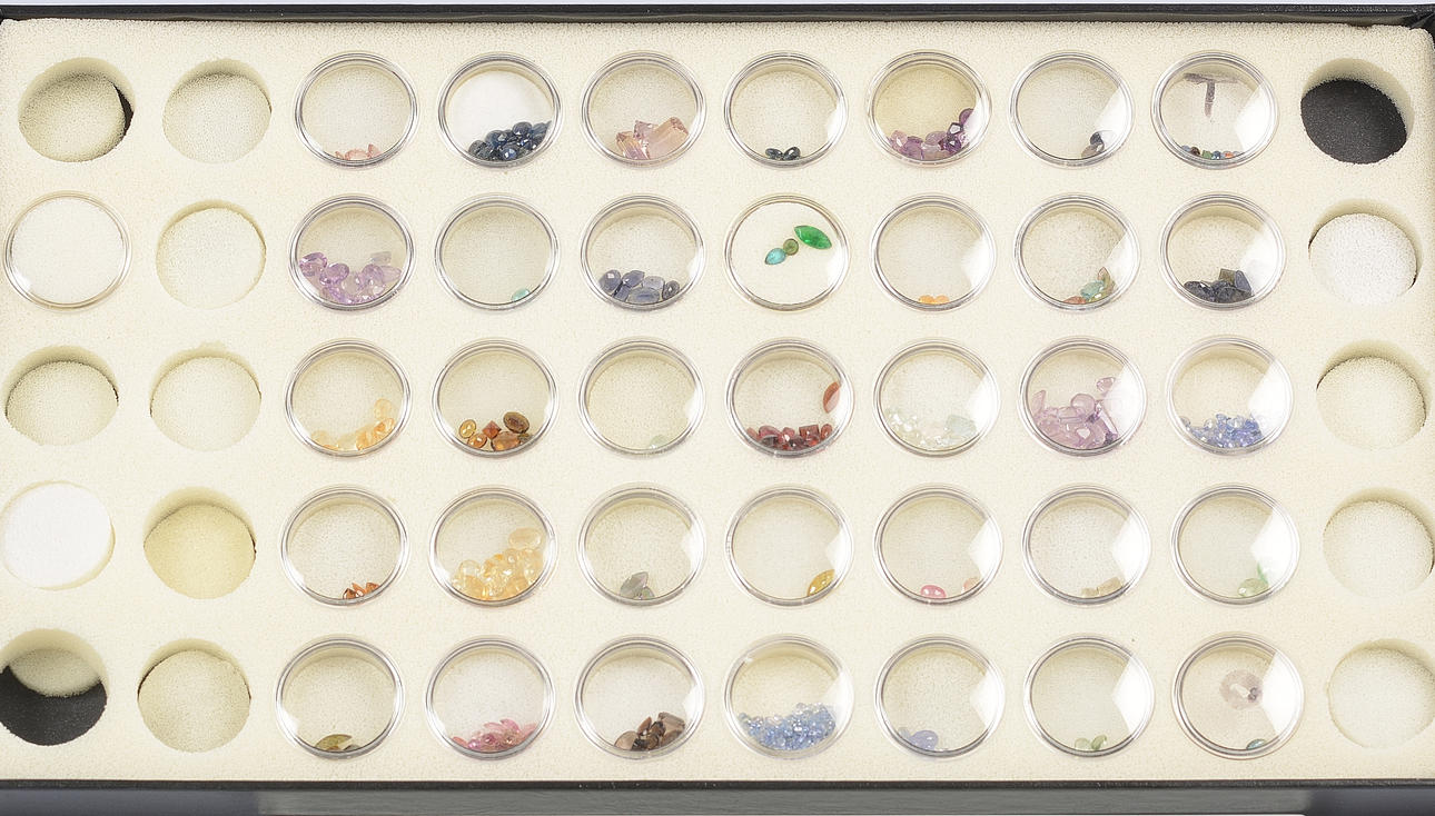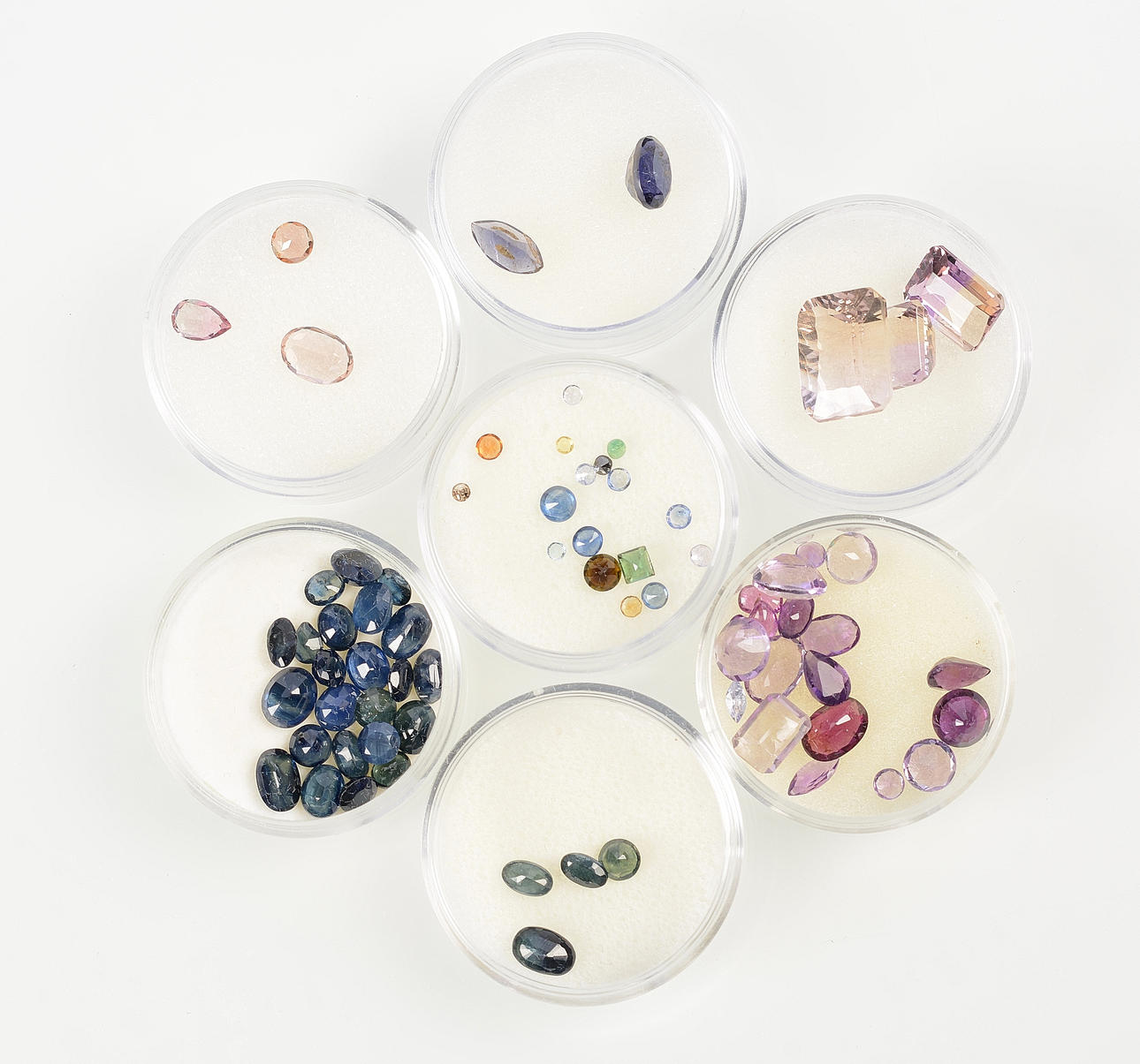 Turmaliner, Tanzaniter, safirer, alamandingranater, ametisterm, ametrin, mfl.