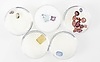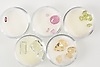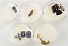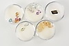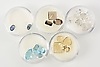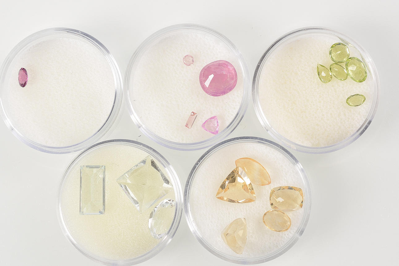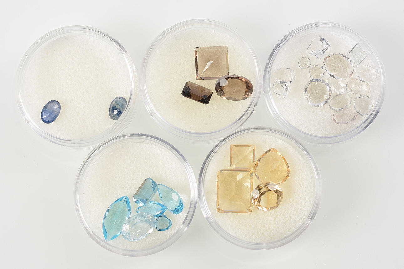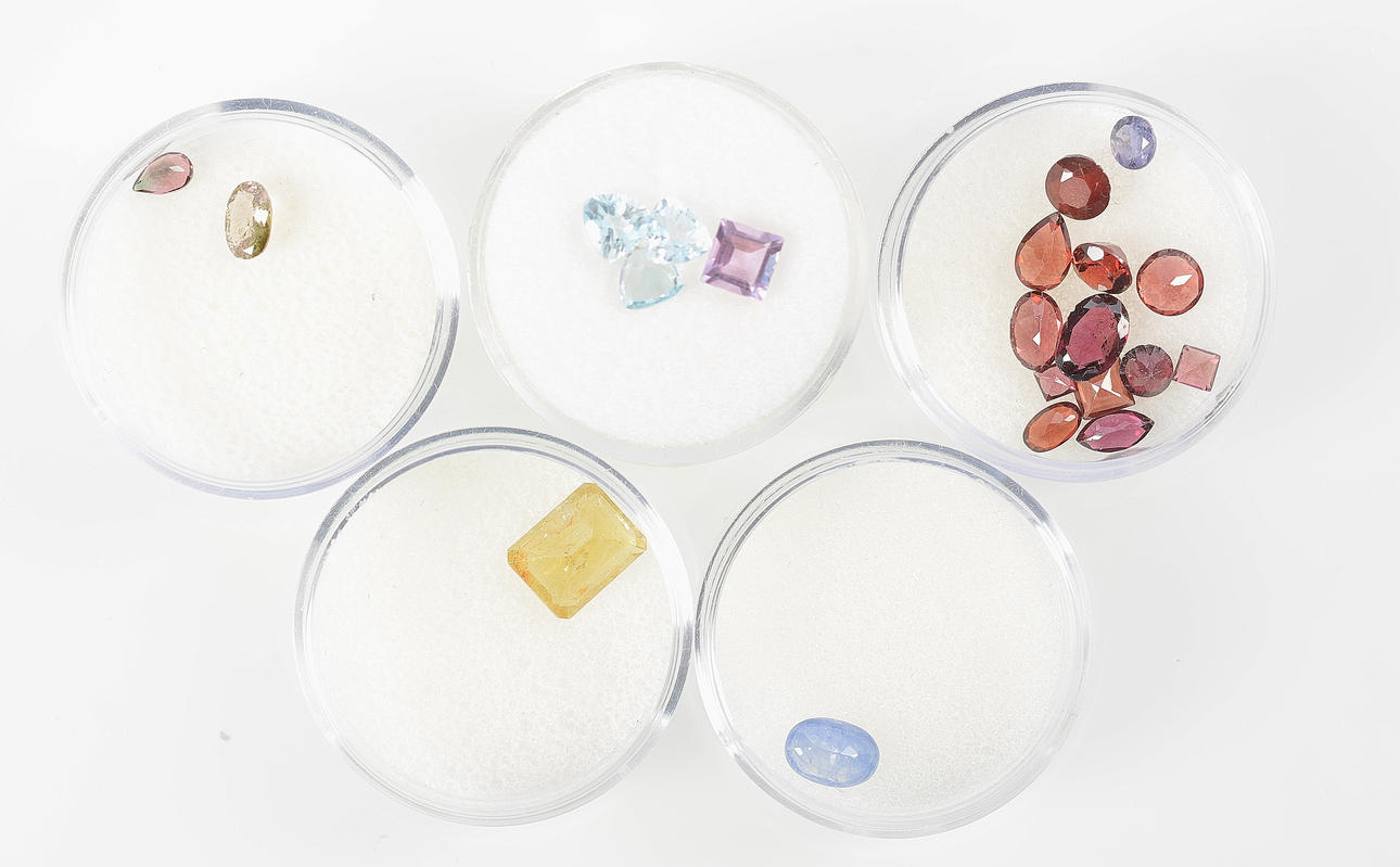 Akvamariner, syntetisk spinell, rubiner, safirer, blått glas, turmaliner, rött glas, ametriner mfl.