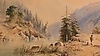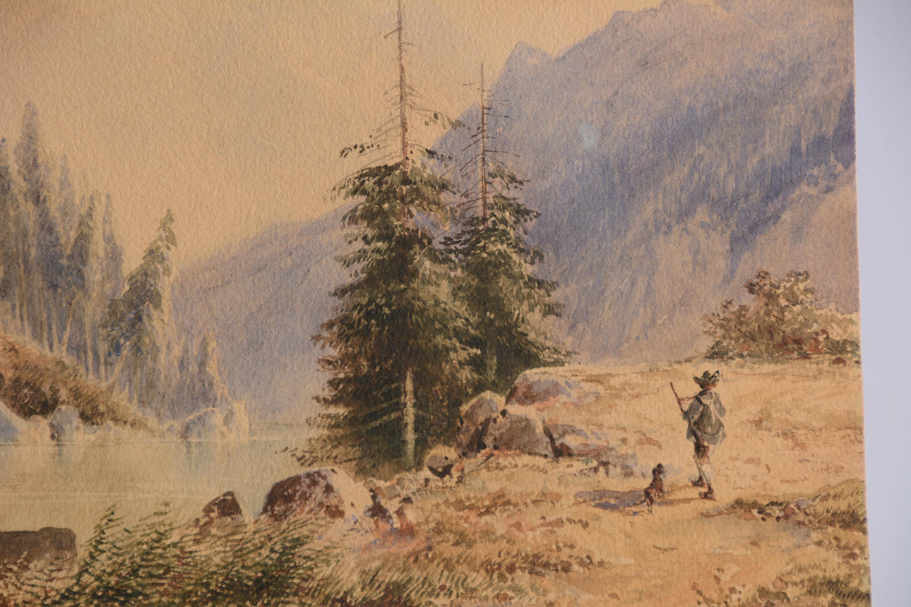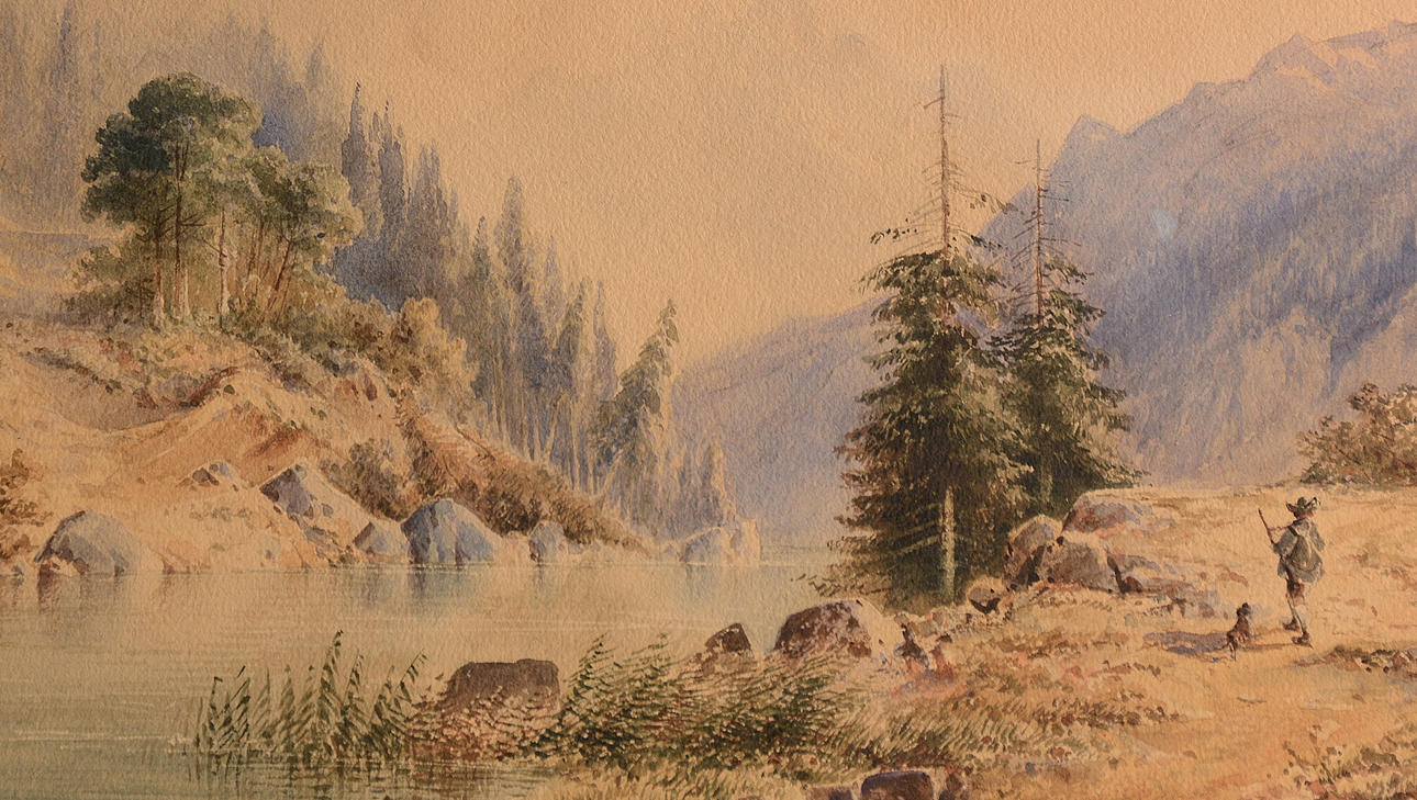 Landskap med jägare. Signerad A. Doll. München. 23x30 cm.