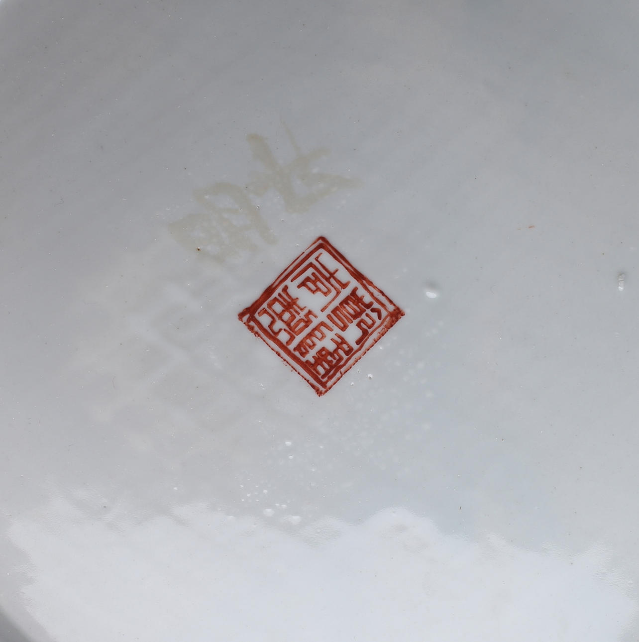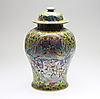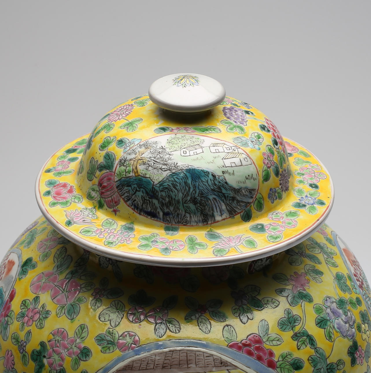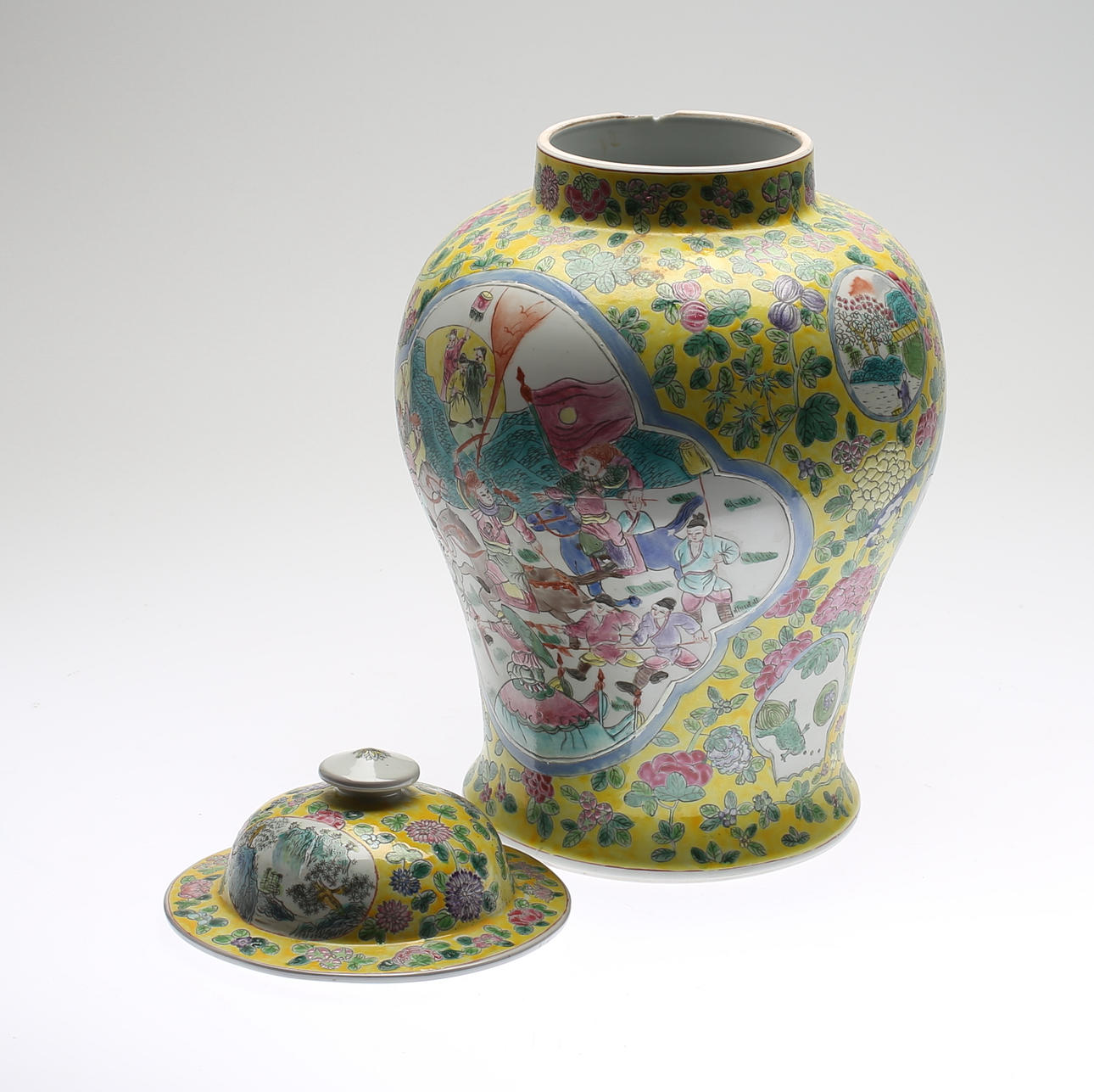 Dekor av blommor, fåglar och figurscener. Höjd ca 42 cm.