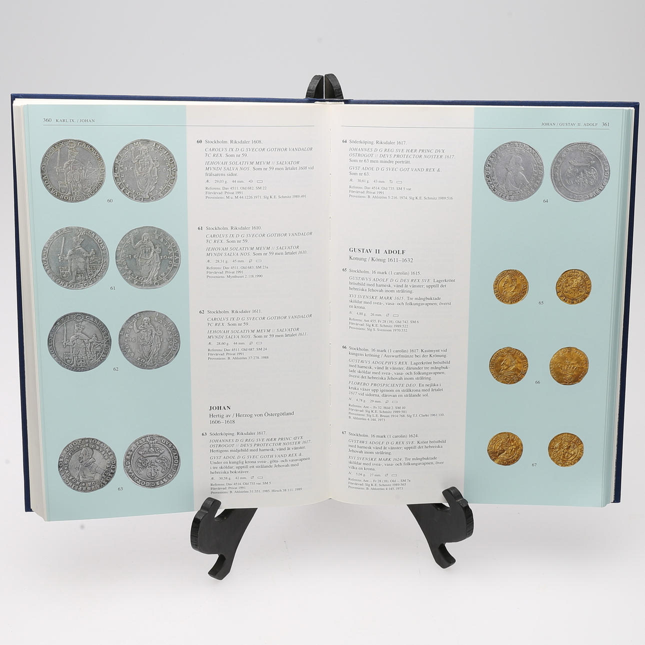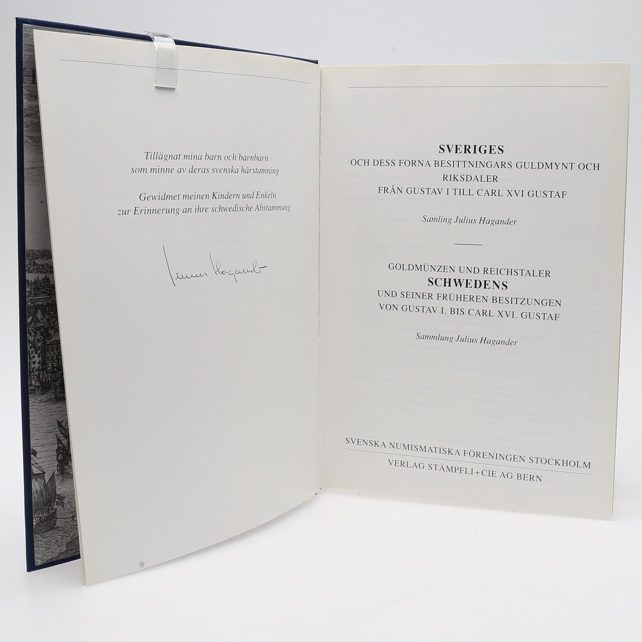 Hagander, Julius. Sverige och dess forna besittningars guldmynt och riksdaler från Gustav I till Carl XVI Gustaf. Samling Julius Hagander. /Guldmünzen und Reichstaler Schwedens und seiner frühheren Besitzungen von Gustav I. bis Carl XVI. Gustaf. Sammlung Julius Hagander. Svenska numismatiska föreningen/Verlag Stämpfli & Cie. , 1996. 574 s. Text på svenska och tyska. Rikt fotoillustrerad även i färg. Förlagets blå klotband med illustrerat skyddsomslag.