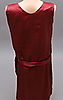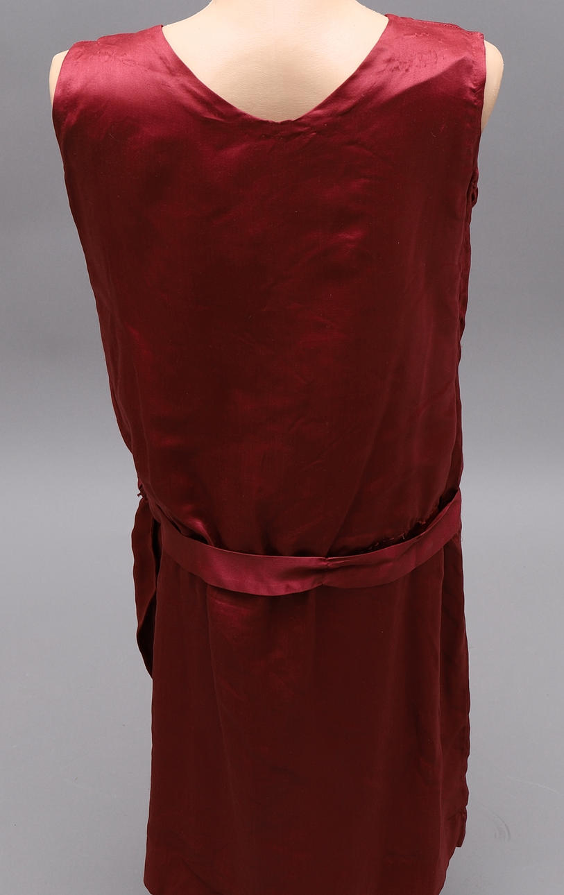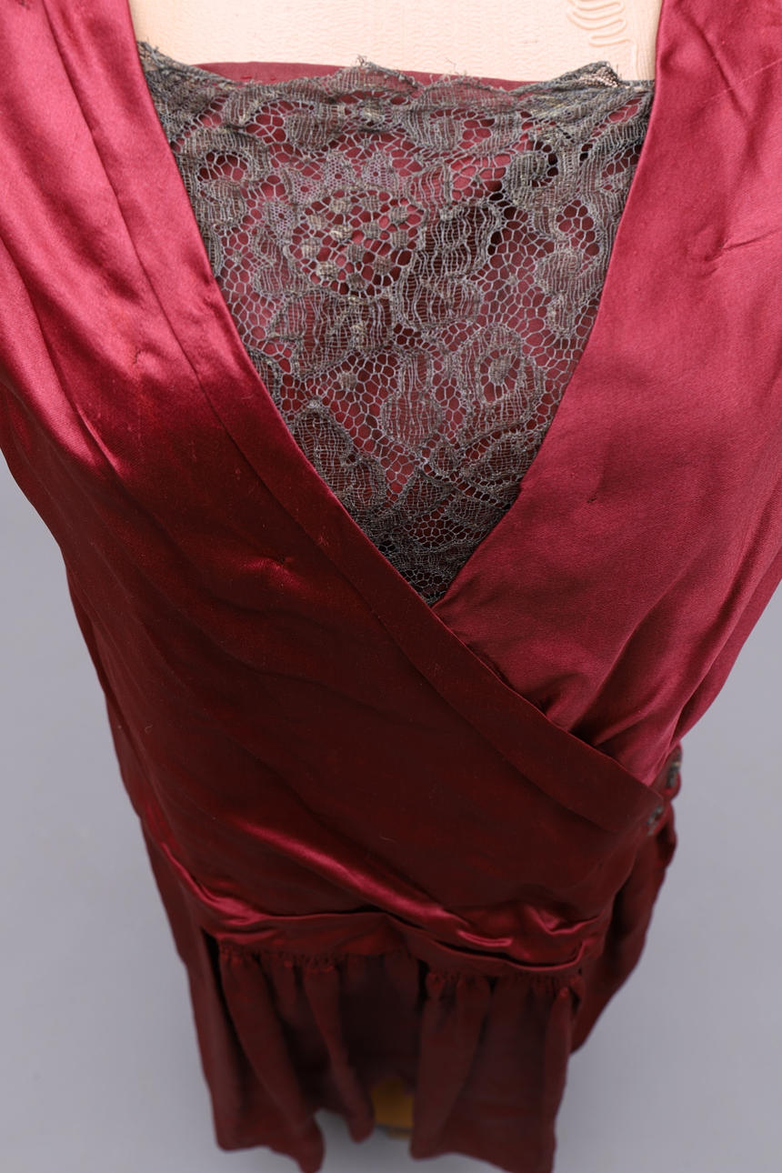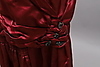 Vinröd satinklänning med spetsdetaljer i byst och pärlbeklädda spetsblommor vid häften. Insytt skärp på baksidan, plisserad framsida under midjan.Längd 99 cm, bystmått 90 cm, midjemått 84 cm
