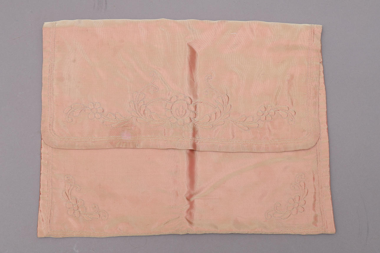 Mjuk satinväska i persikofärgat broderat tyg, 41x31 cm, troligtvis en förvaringsväska för kläder.