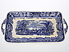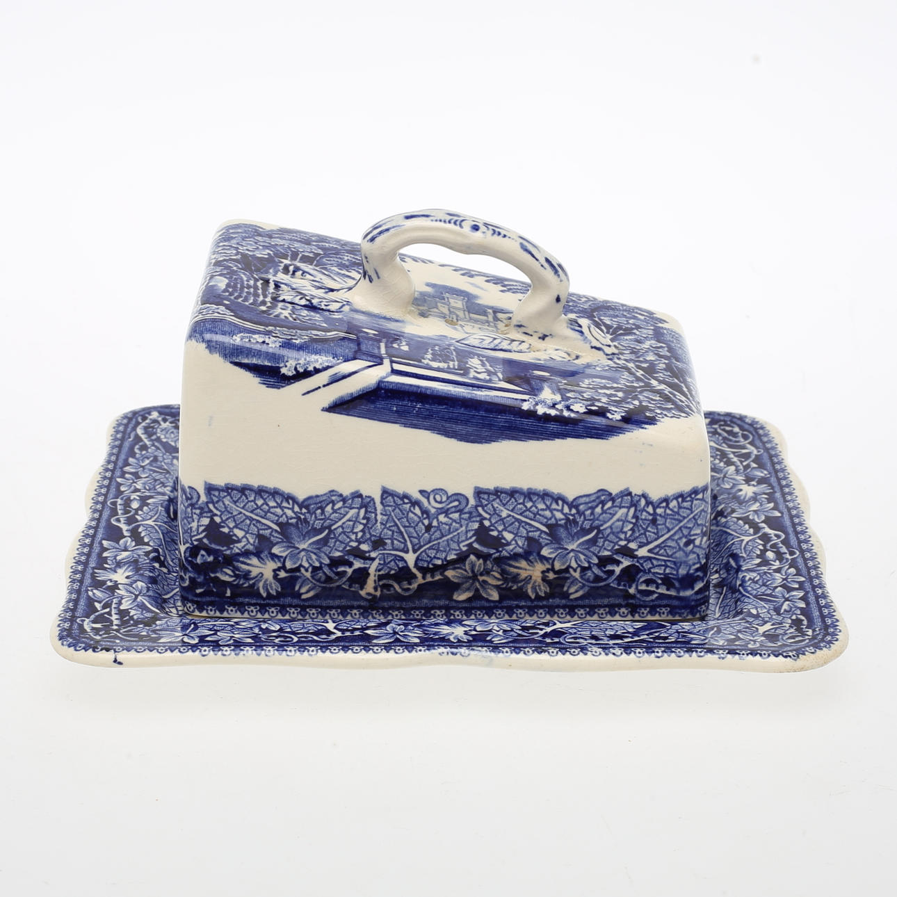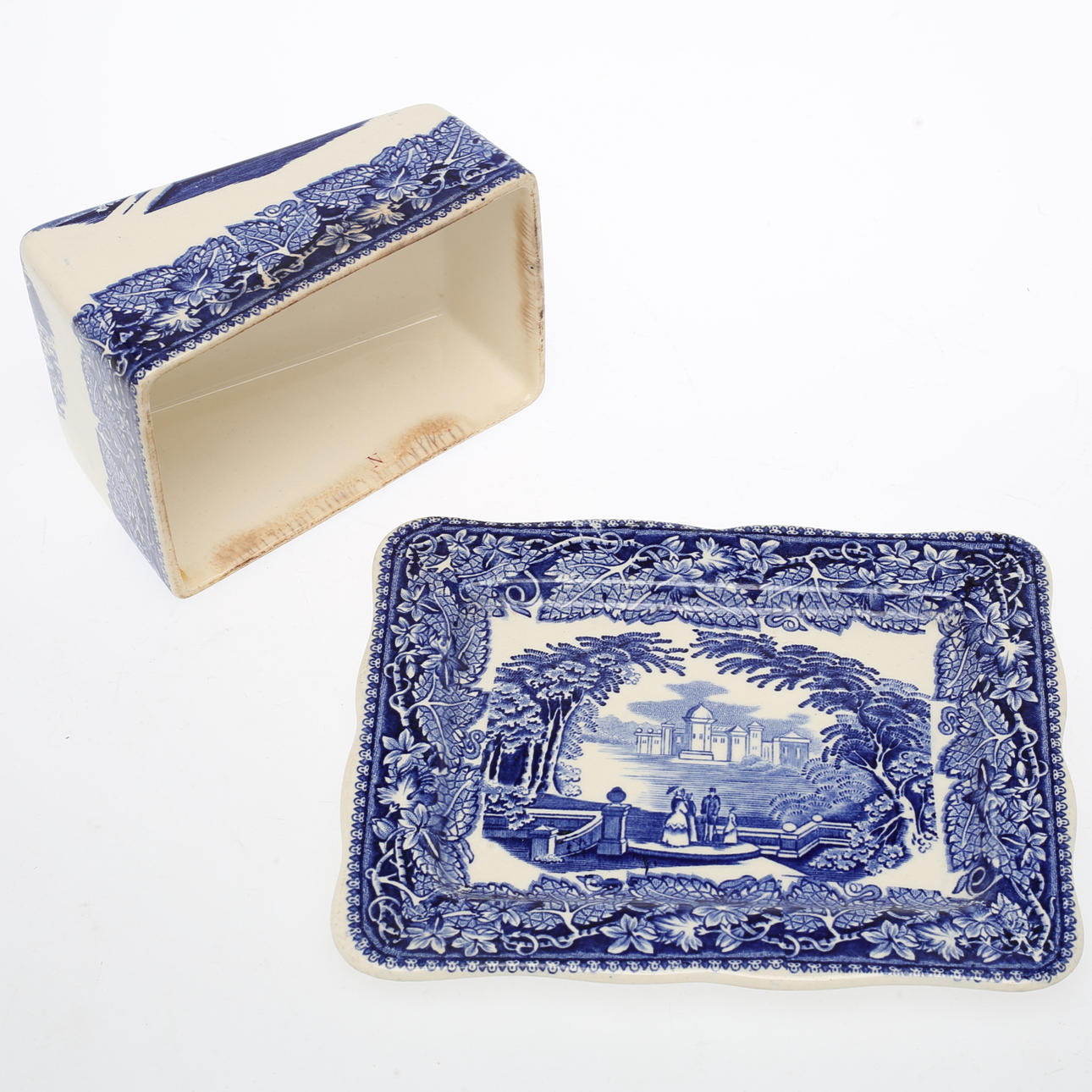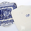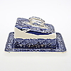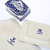 Avlångt fat med fläckar, ostkupa med krackelyr och fläckar invändigt.