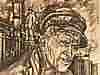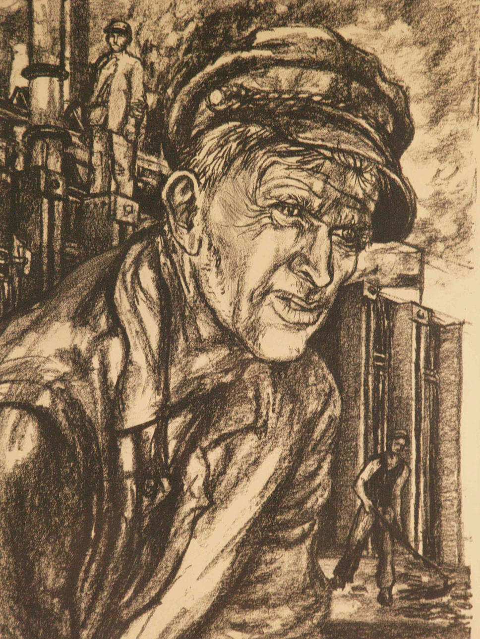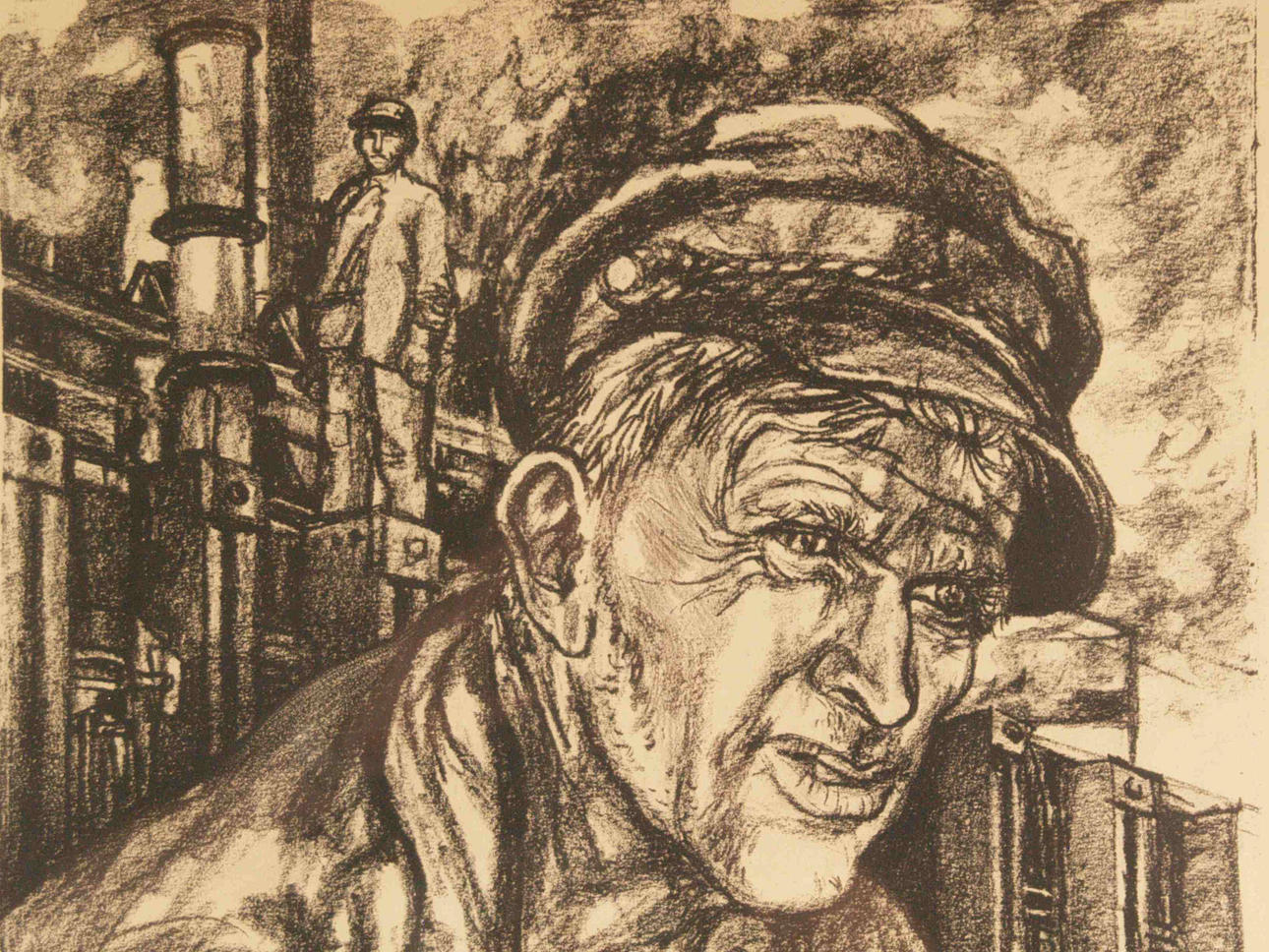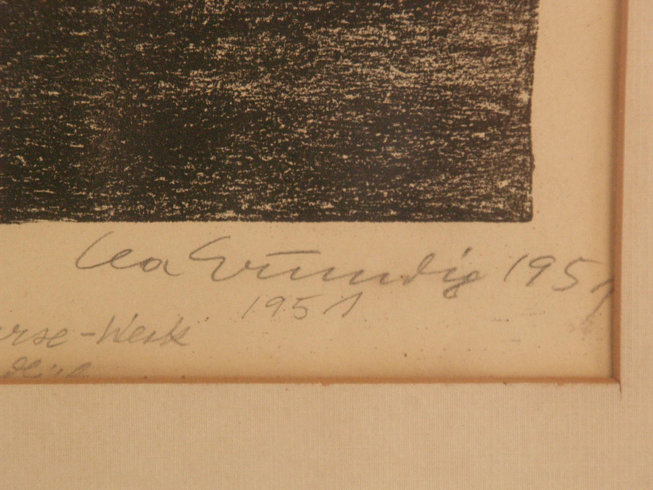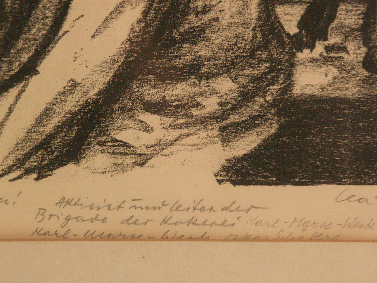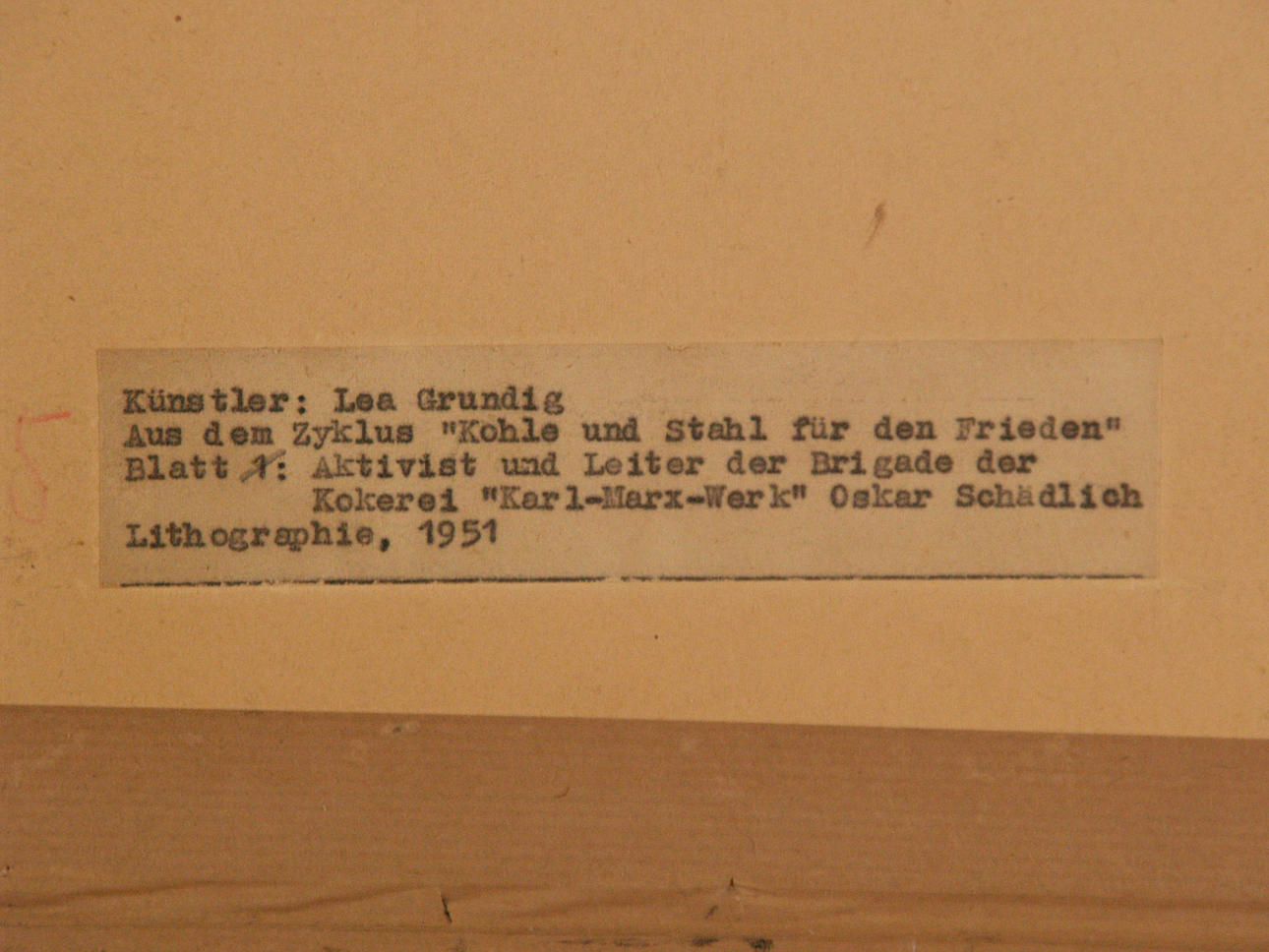 Grundig, Lea (1906-1977) - ”Aktivist och chef för koksplantans brigad 'Karl Marx-Werk' Oskar Schädlich”, originalkritlitografi ur den grafiska cykeln ”Kol och stål för fred”, 1951, signerad i bly, betitlad och daterad, inramad med PP under glas, PP utklipp ca 64x47cm.