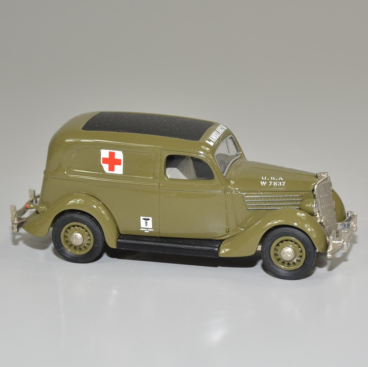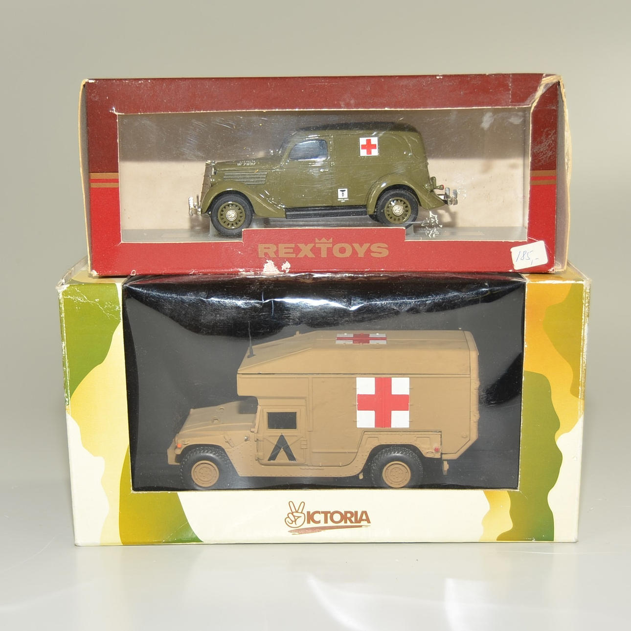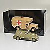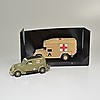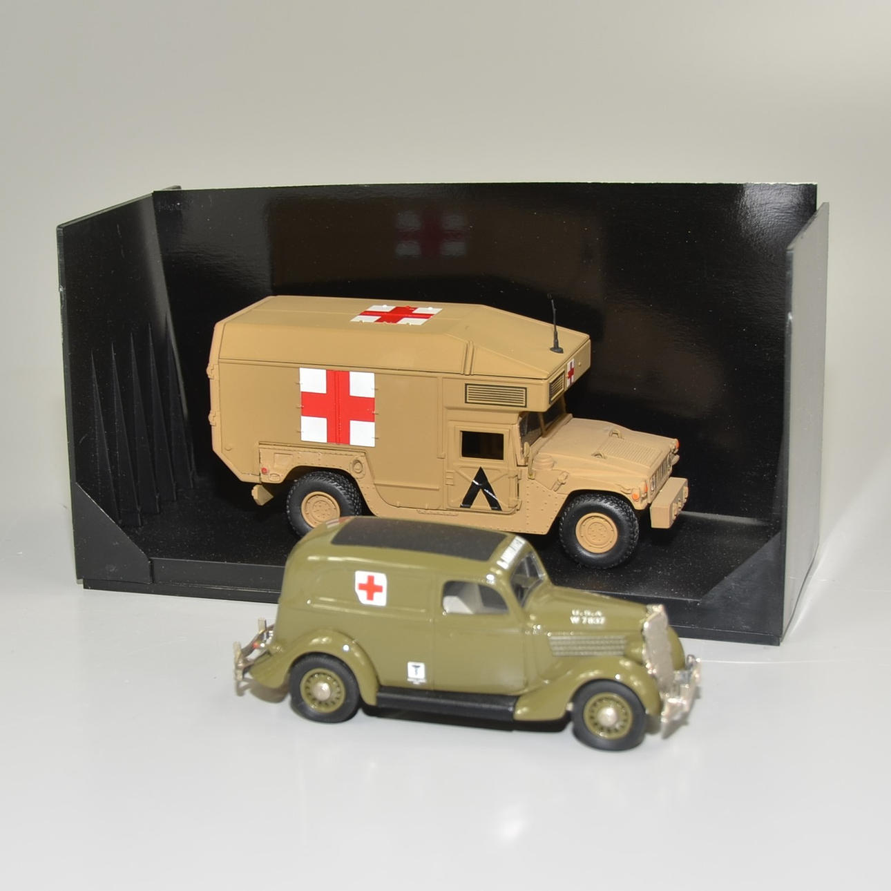 Krigsfordon. Ford 1935 Sedan Delivery 45, Rextoys, 10,5 cm lång. Victoria Hummer VS Army Ambulance Desert Storm, 12.5 cm lång.