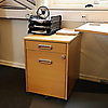 Skrivbord på benställning i metall, skiva i bokfanér. Hörn höger. IKEA
