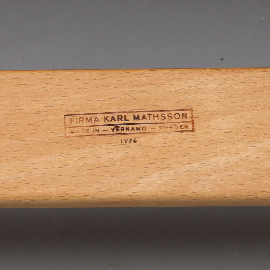 Stämpel- och etikettmärkt, producerad av firma Karl Mathsson 1978, linnegjord på stomme av böjtra.
