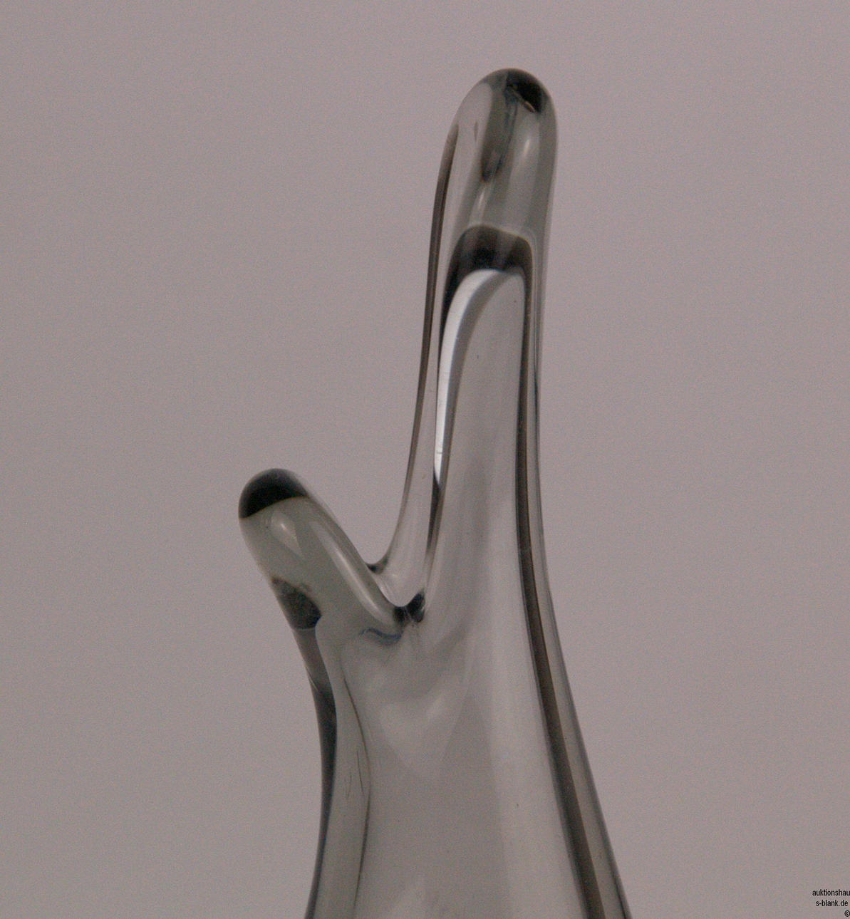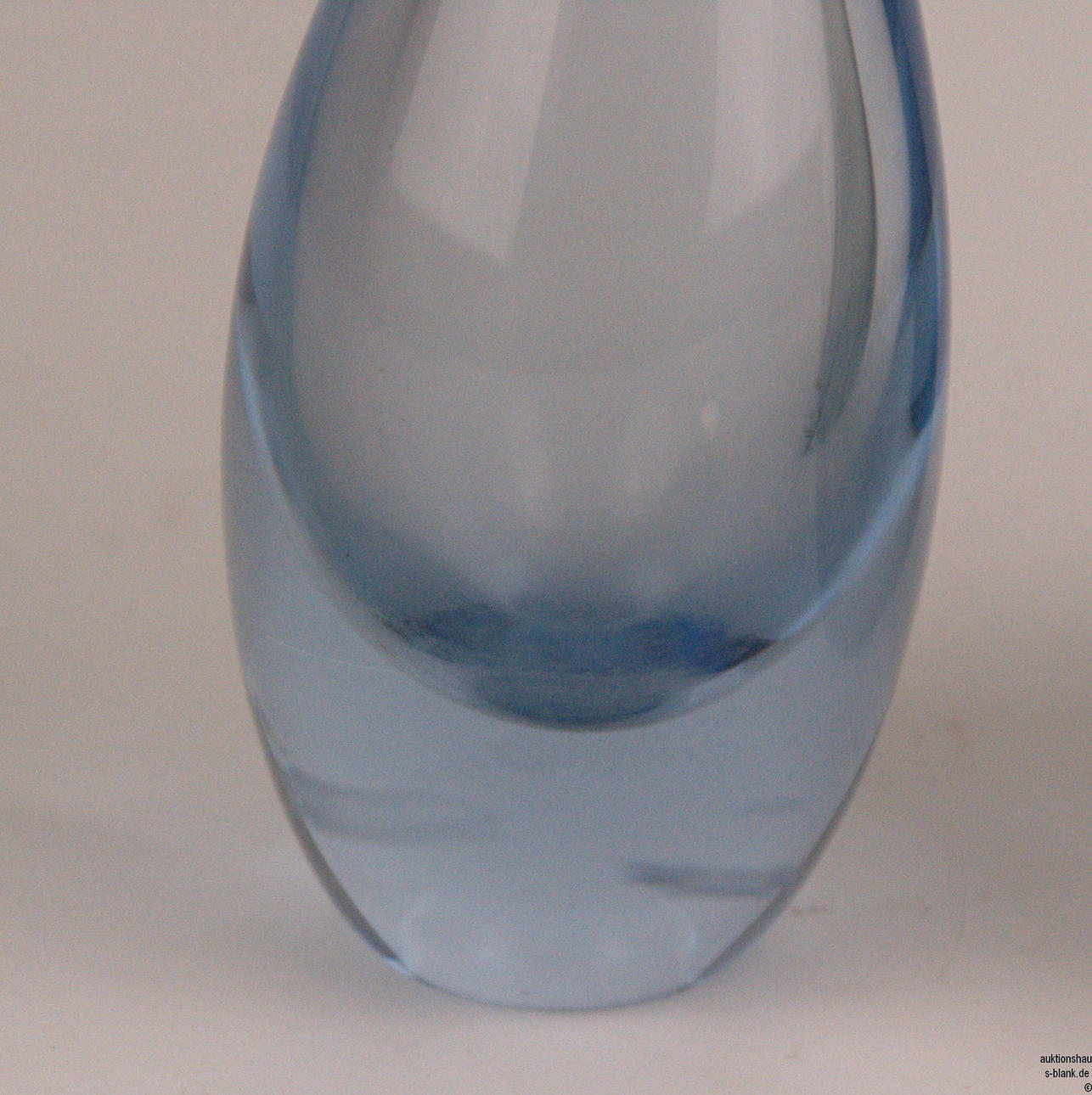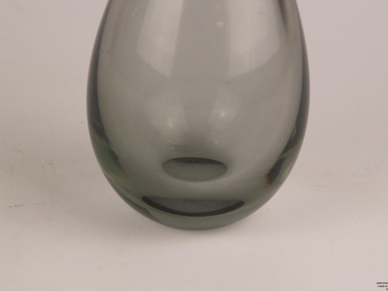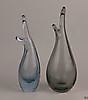 Vaser, 2 st - Holmegaard, Danmark, design av Per Lütgen, tjockväggigt klart glas, 1x med rökfärgat underlag, signerad och daterad '1954', h.ca.19cm, 1x med vattenblått underlag, signerad och daterad '1972', h.ca.17cm.