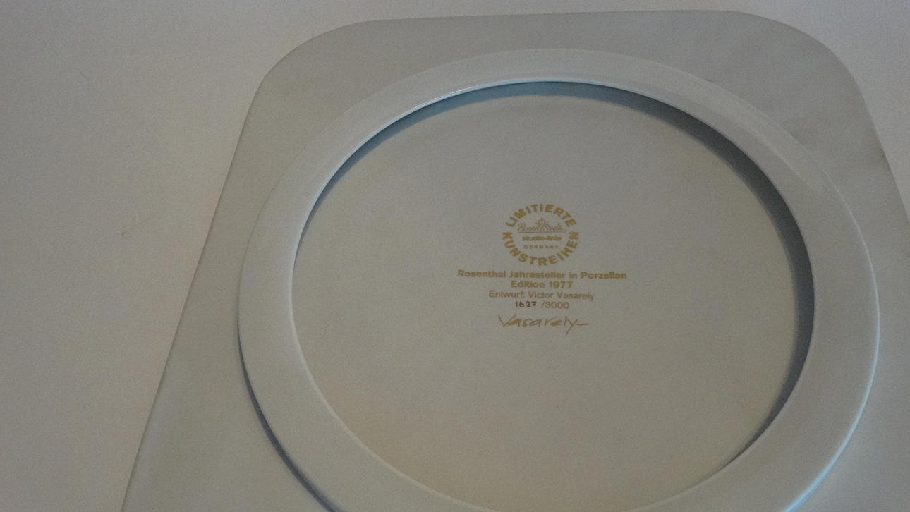 Rosenthal porslin årstallrik med Vasarely-motiv, ca 34 cm diameter.