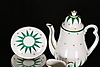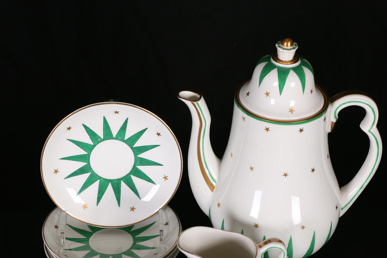 Vitt benporslin med dekor av stjärnor och dekordetaljer i guld samt gröna flikar.
