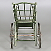 Barnvagn i grönmålat trä. Längd 110, bredd 48, höjd 88 cm.