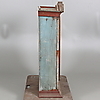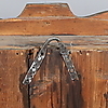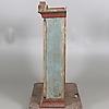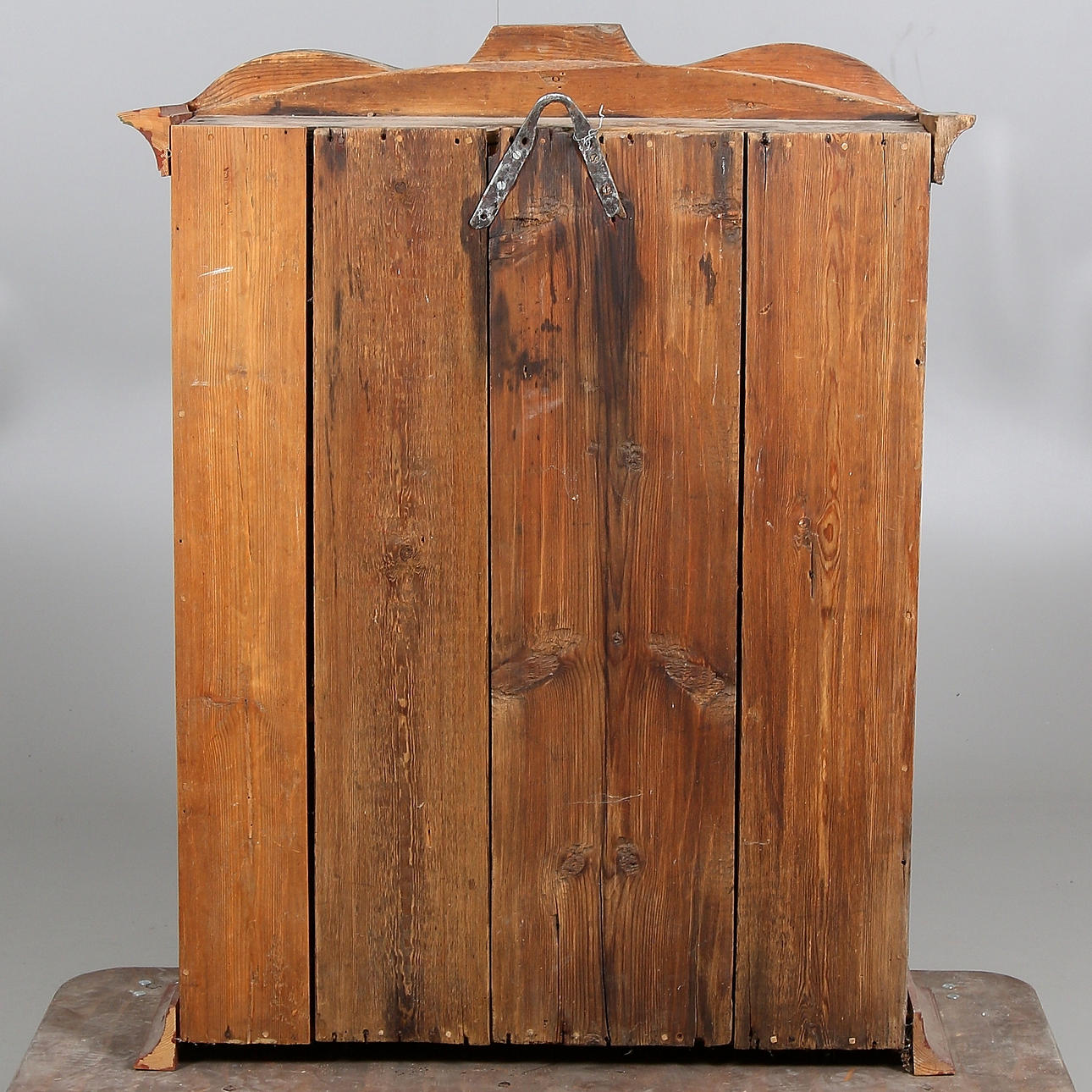 Färgavfall. Ställvis senare bemålning. Hela listverket i skåpets nederkant samt listen på högra kortsidans överkant är av senare tillverkning. Trälagningar. Senare gångjärn. Urslag i träet. Låskammare och nyckel saknas.