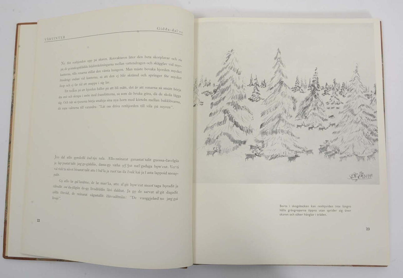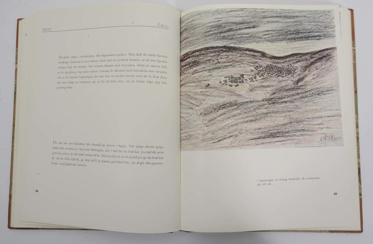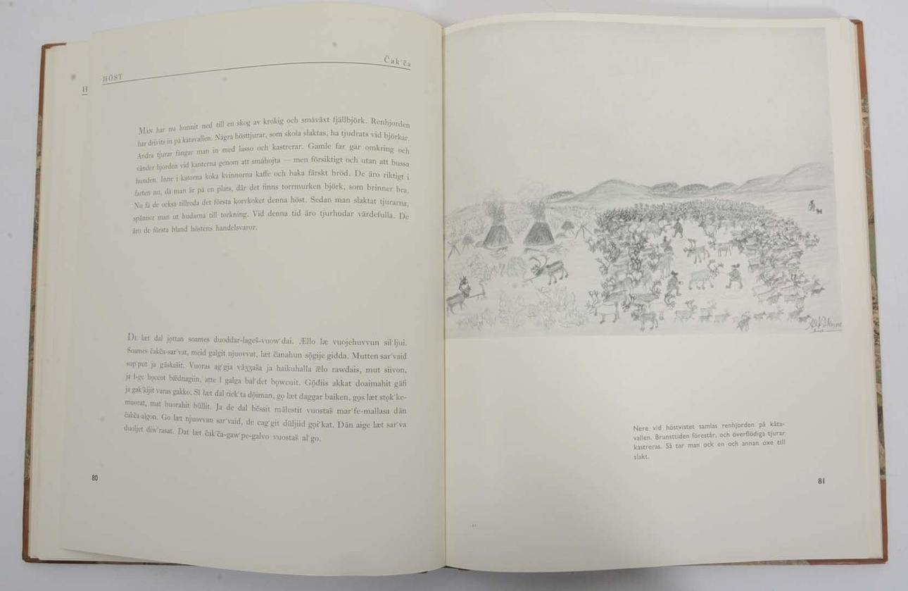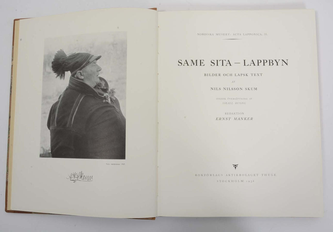 Bokförlags Aktiebolaget Thule 1938, 157s med illustrationer delvis i färg och lapsk text av Nils Nilsson Skum, svensk översättning av Israel Ruong, redigerad av Ernst Manker. Halvfranskt band i brunmarmorerat kalvskinn, fem höjda bind, förgylld marokängryggtitel marmorerade pärmöverdrag, medbundet främre omslag;
