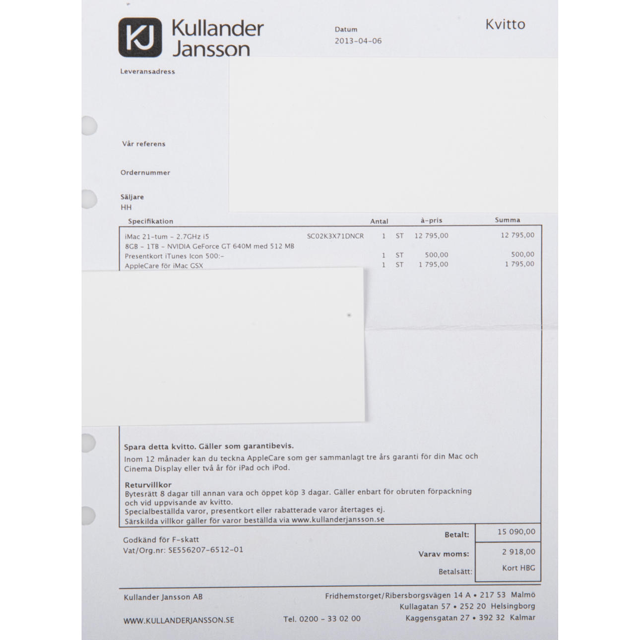 iMac 21-tum - 2.7Ghz i5 8GB - 1TB - NVIDIA GeForce GT 640M med 512 MB Tangentbord samt mus medföljer. Datorn är återställd.
