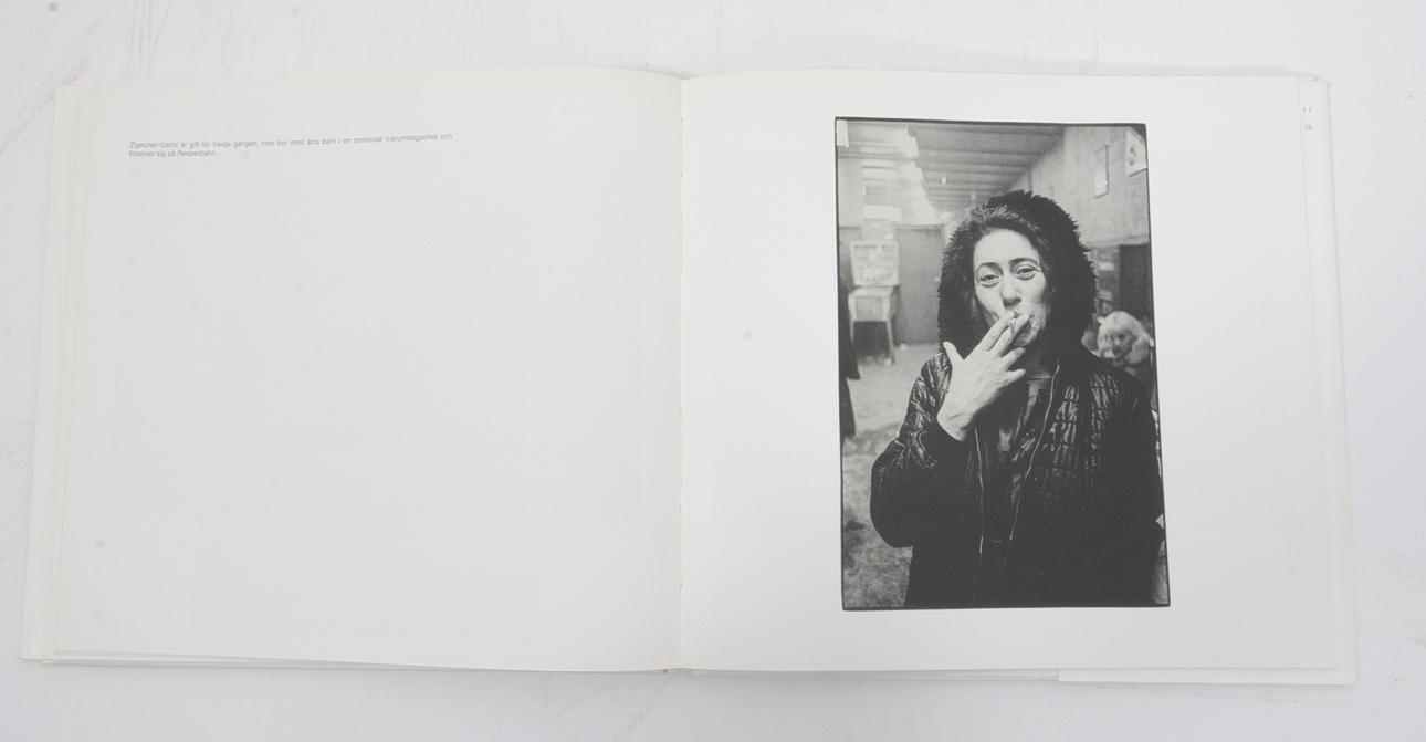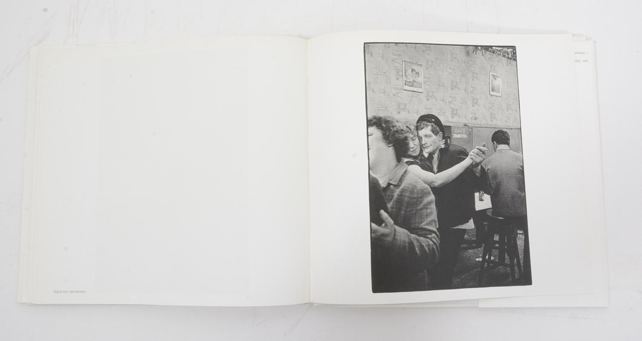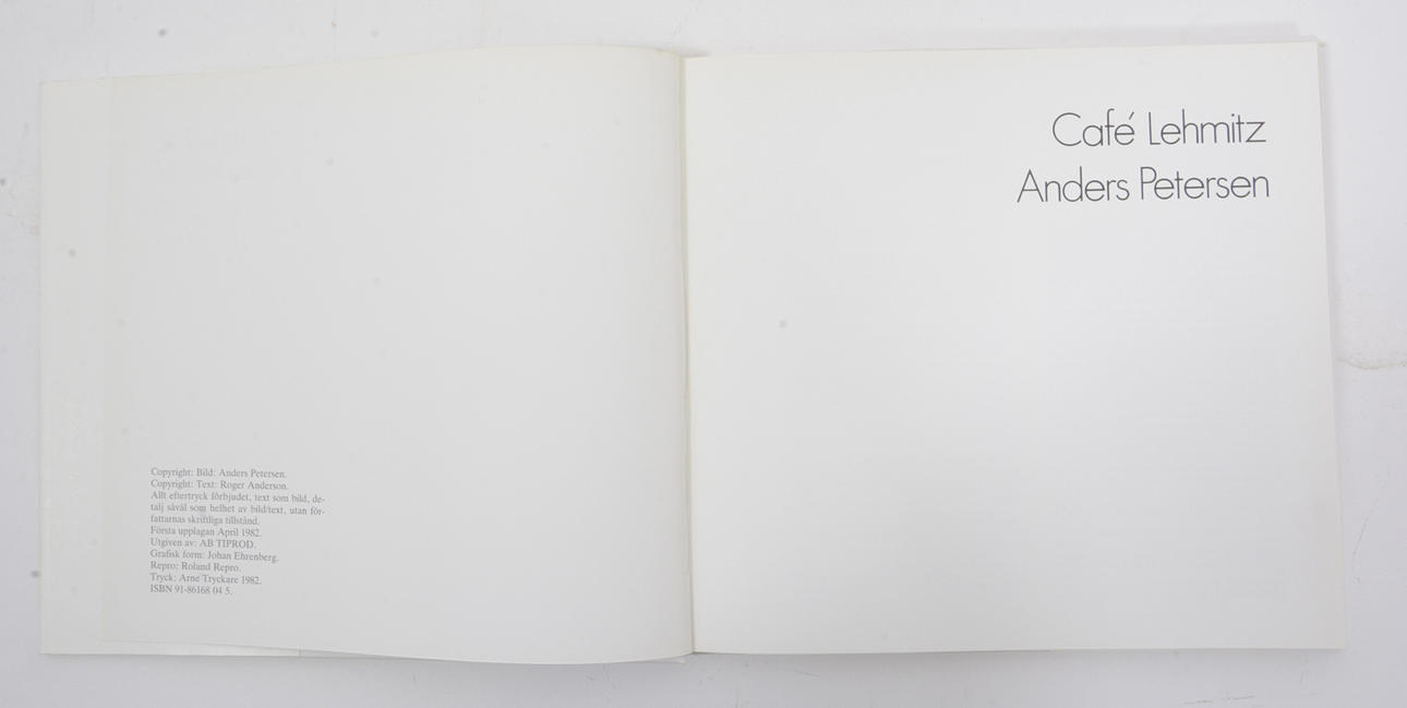 AB Tiprod, 1982. Opaginerad (c. 123 s.) Tvärformat (24,5 x 26,5 cm). Vitt kartonnage. Text av Roger Anderson. Svartvita fotografier av Anders Petersen.