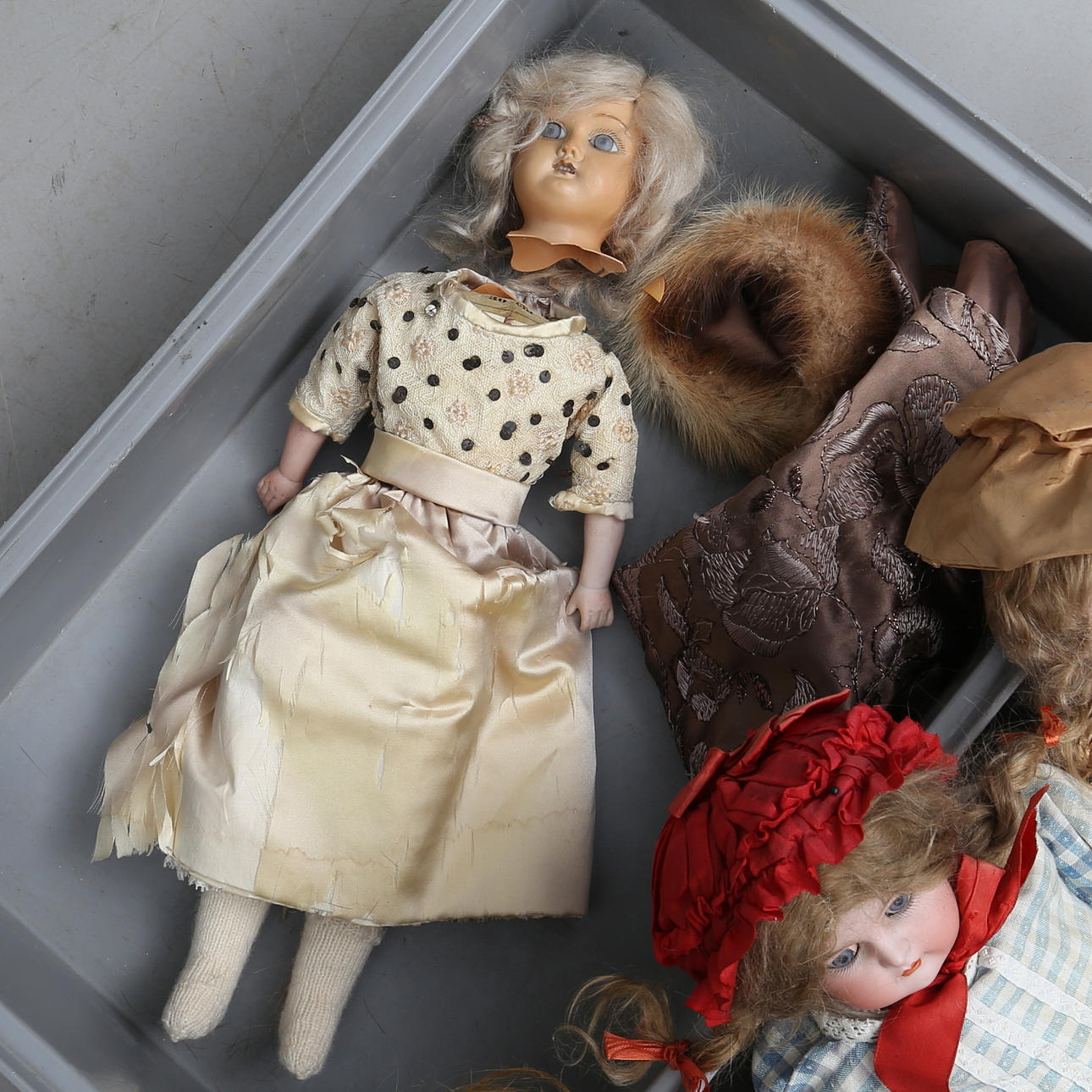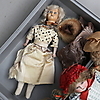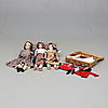 Tre dockor med huvuden i porslin, En docka i plast Med tillbehör i form av kläder. Dockornas längd ca 39-64 cm.