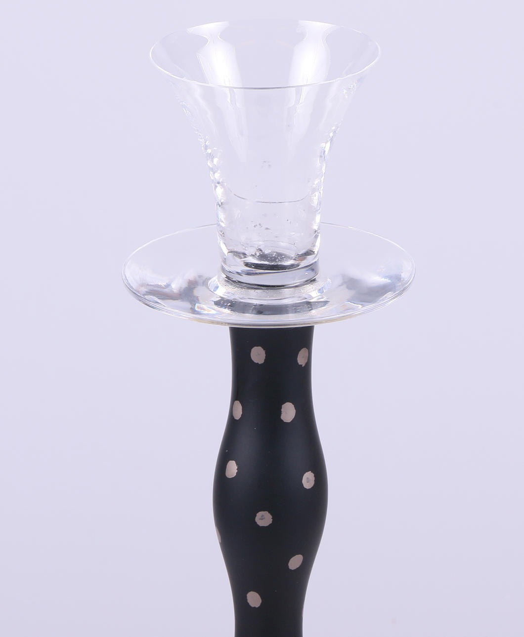 Ljusstake med dekor av silverfärgade prickar mot svart botten Höjd 37,5 cm.