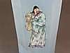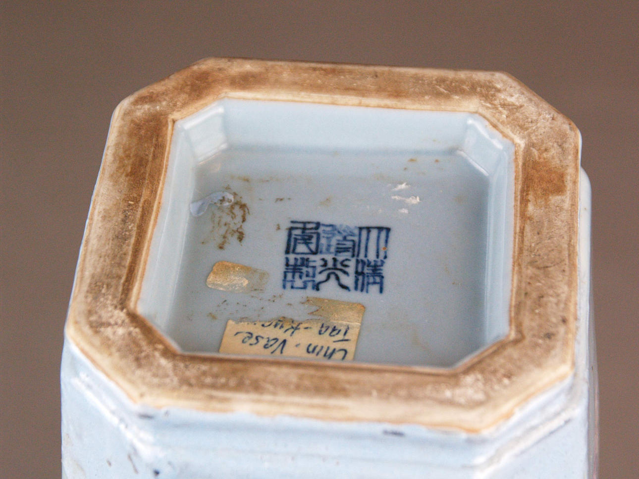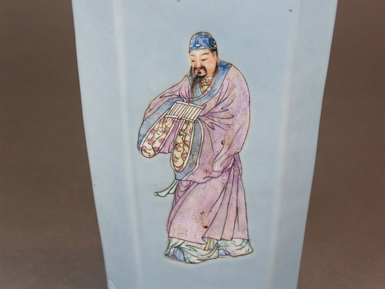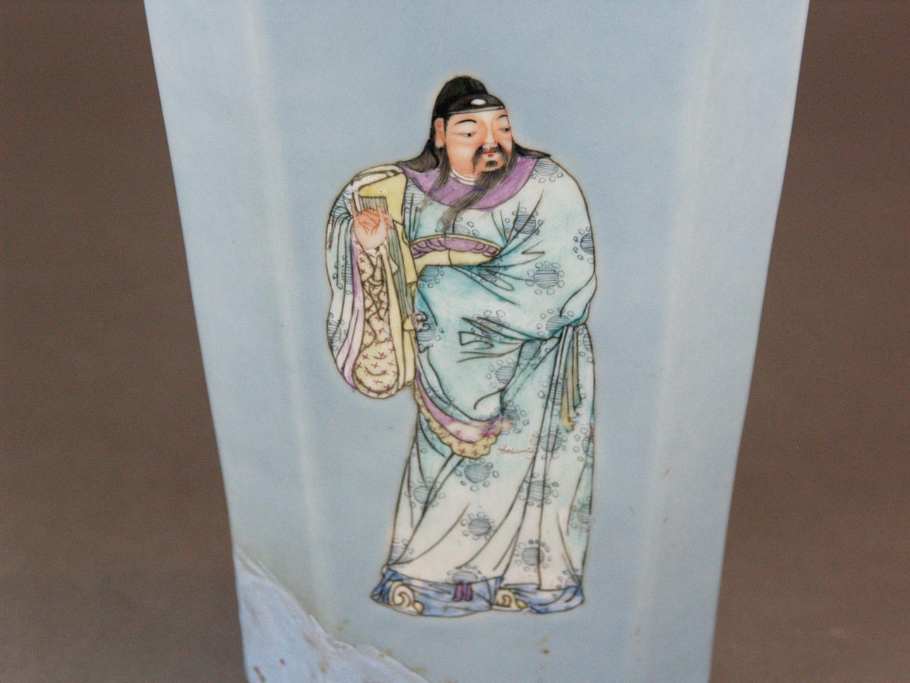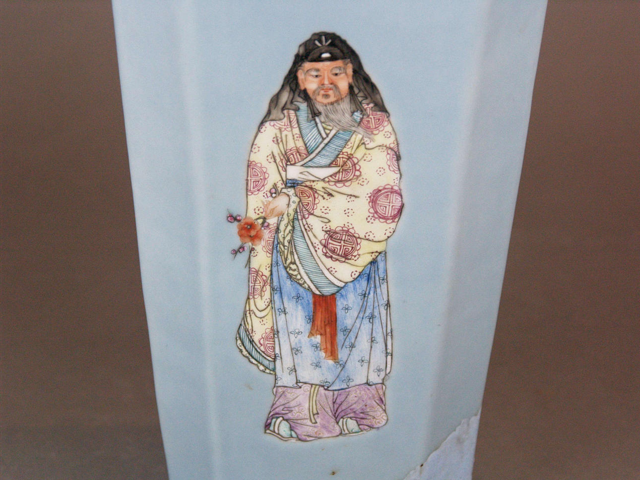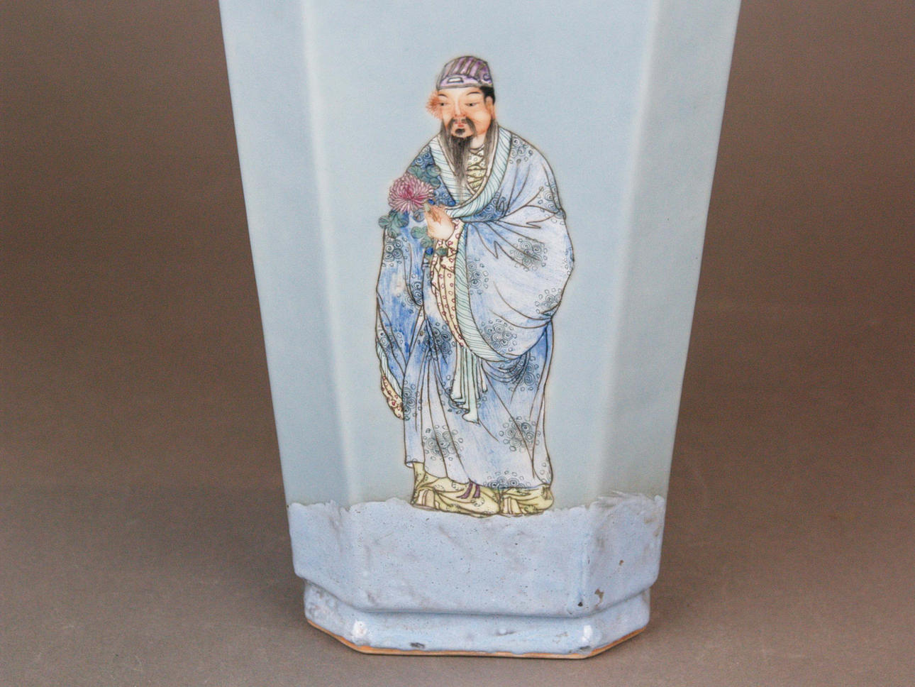 Vas - 1800-talets Kina, fyrkantig form, ljusblå bakgrund, målad med 4 figurer, golvstämpel, h.ca. 33 cm.