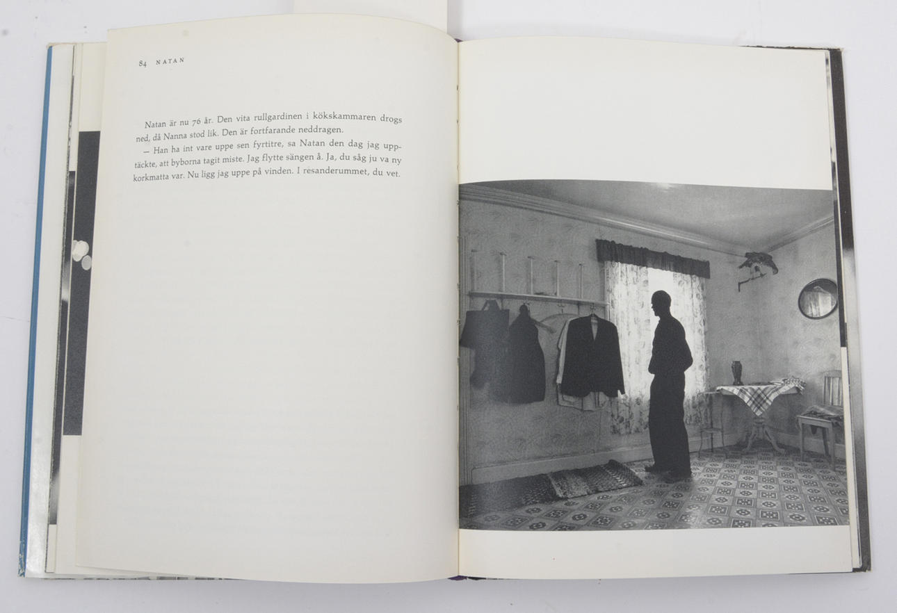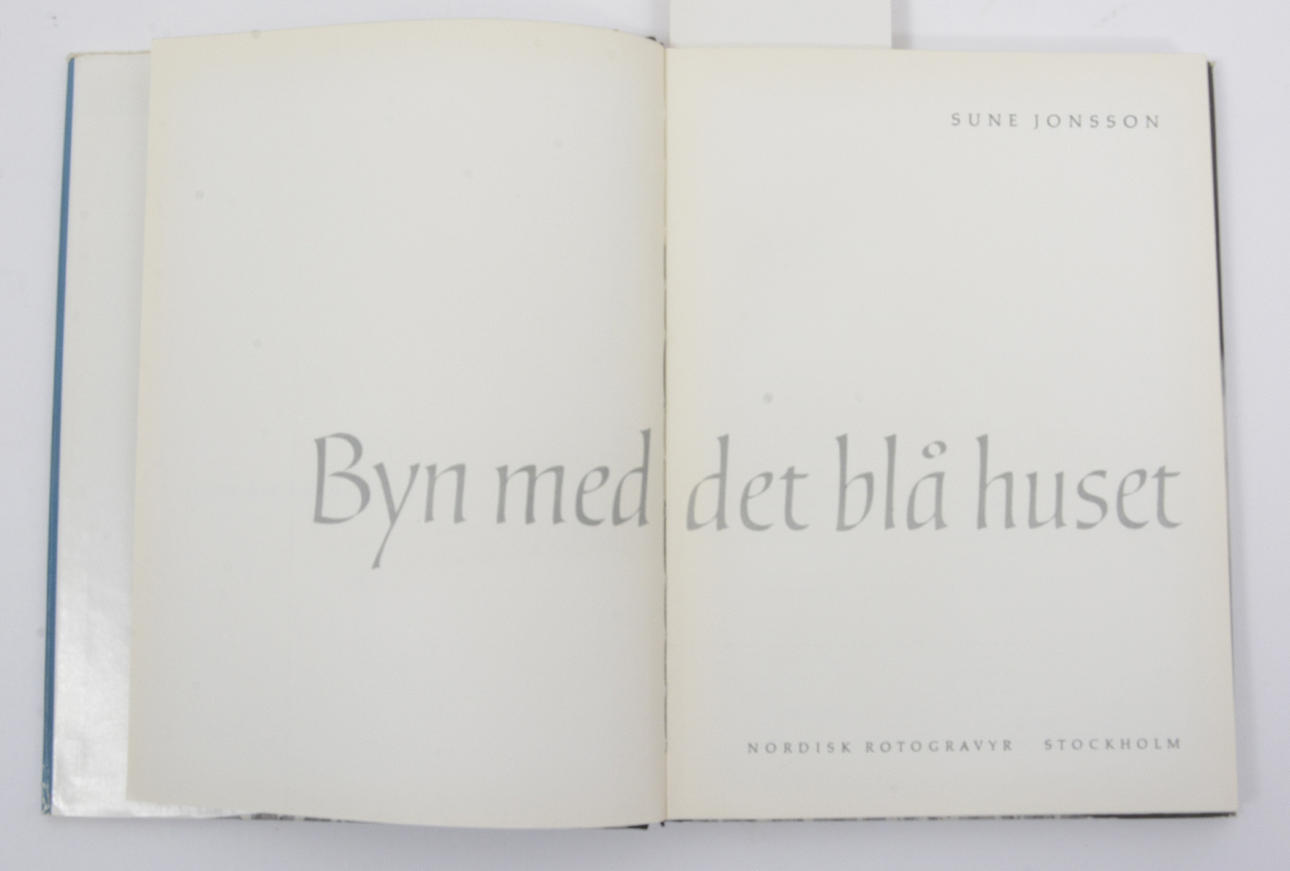 Första upplagan. Innehåll: Människorna i min by; Noveller: Drömmaren i det blå huset; Tystnaden; Natan; Hämtaren; Den lille; Porträtt: Farbror Victor; Plåtslagare Algot Engman; Smeden Helmer Jonsson; Klock-Jakob; Skräddaren Enok Pil; Skomakar-Sundström; Sigurd; Ragnar Karlsson; Emil; Natan; Bergfelt; E A Forss; Pinnvarvarns Judit; Fru Olga Rast; Filip Svart; Tattarna; Händelser: Hemförlossning; Söndagsskola; Skola; Skolavslutning; Dans; Bröllop; Man reser ett tält; Hämtaren; Auktion; Tattarlasset; Sommarlagården; Den lille går till sängs.