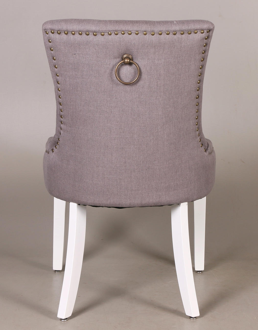 Stolar 6 st. Grått tyg med stoppad sits och rygg, med dekorspik och dekorring, ben i vitlackerat trä