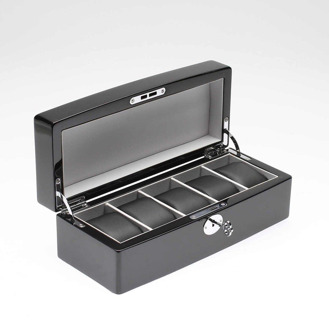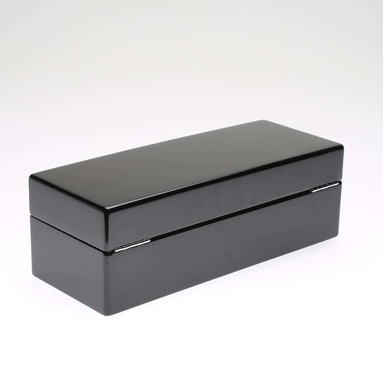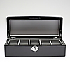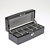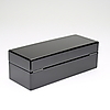 Svartlackerat trä. Insida klädd i textil. Plats för fem klockor. Längd 29. Bredd 12. Höjd 10 cm.