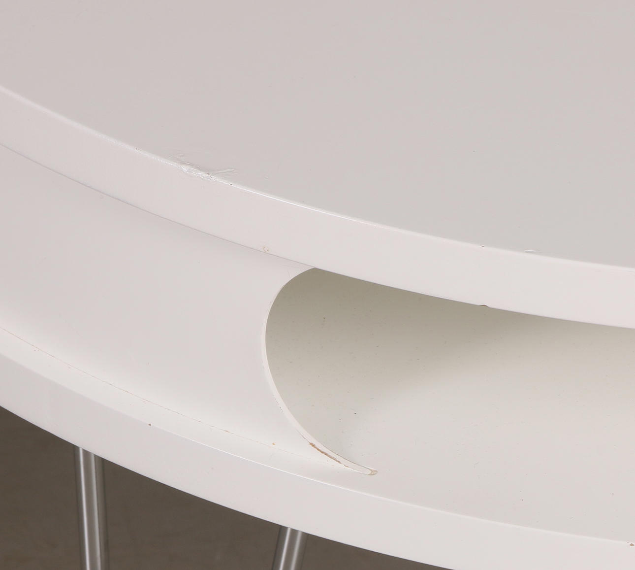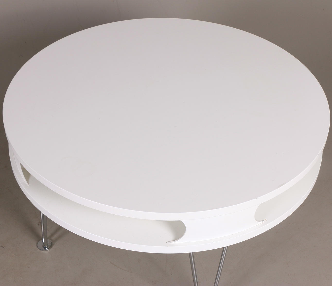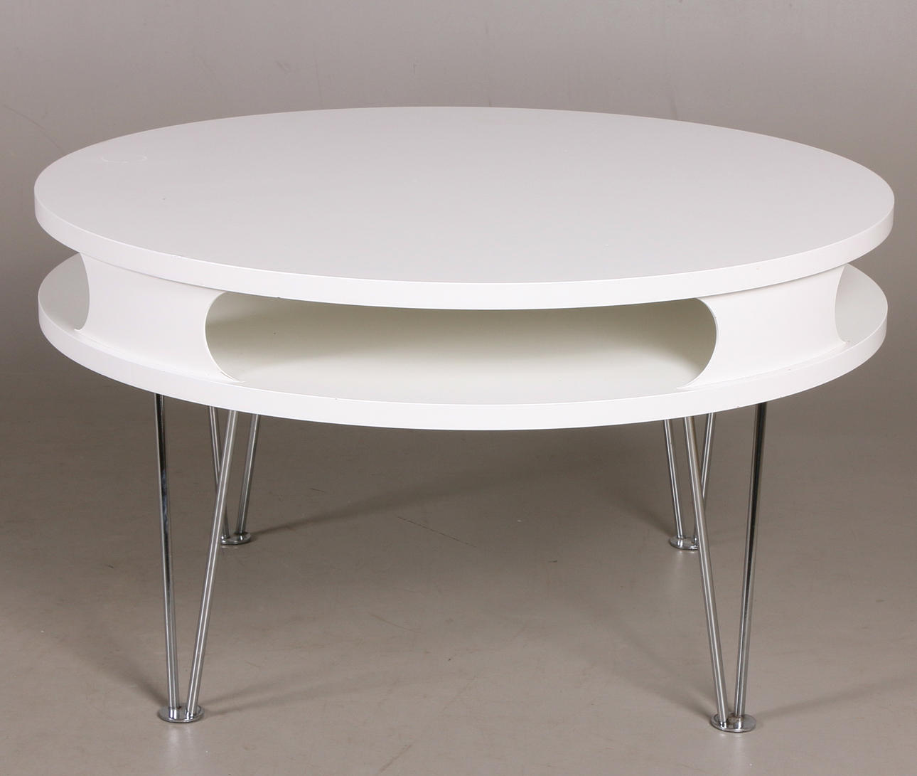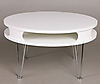 Soffbord, vitlackerad med kromad benställning, avlastningsyta under toppskiva Diameter 80, höjd 44,5 cm.