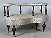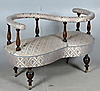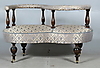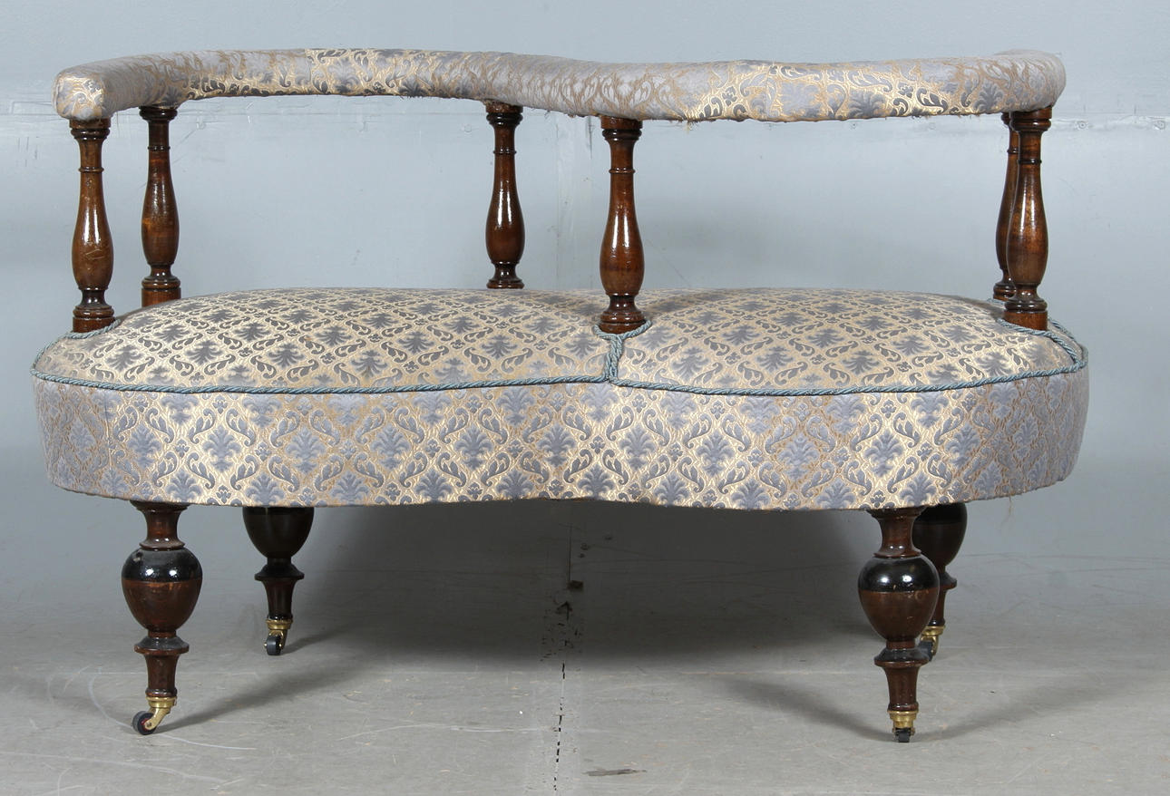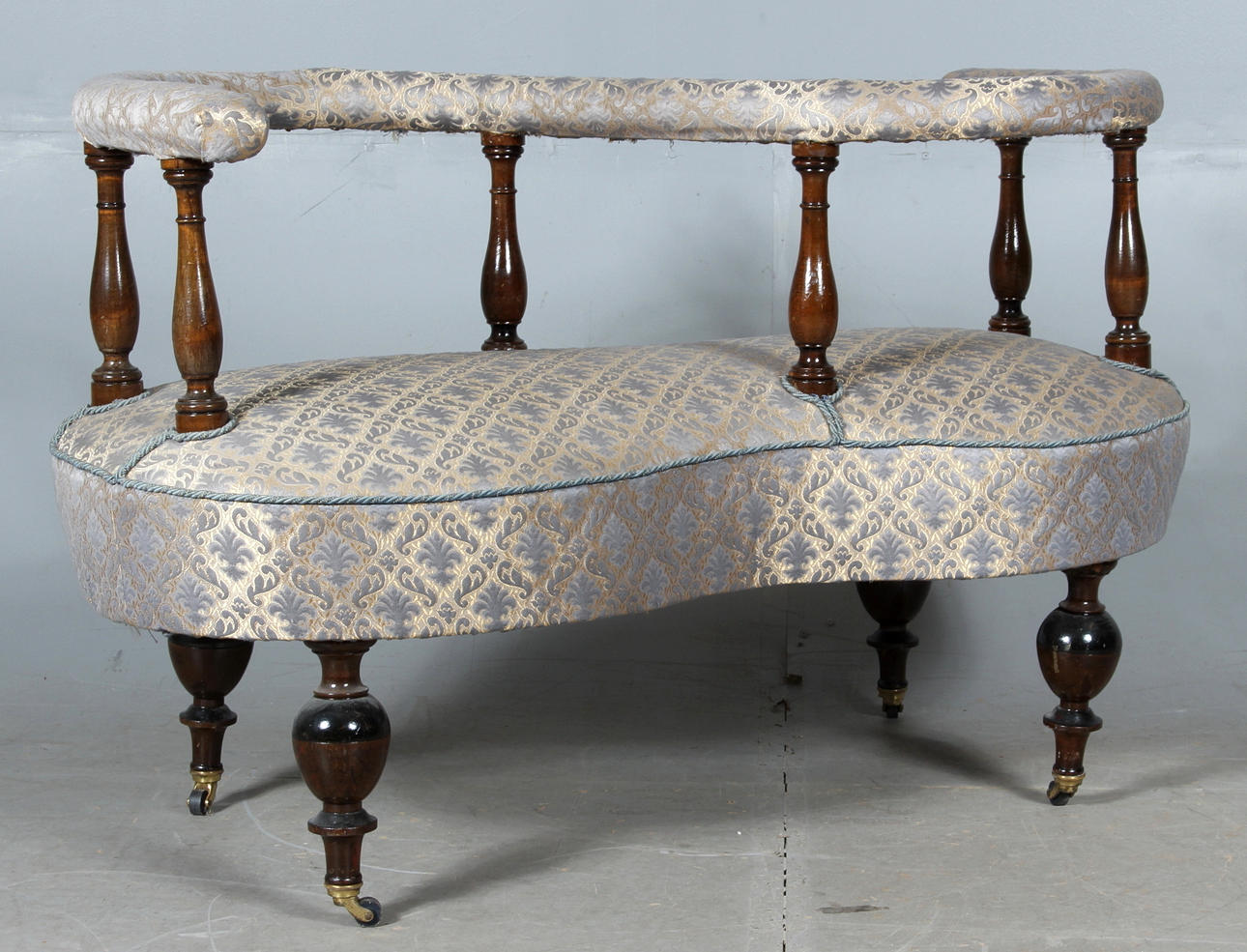 Fast stoppad sits och armlän. Fotavslutningar med hjul, längd 110, bredd 58, sitthöjd 43 centimeter.