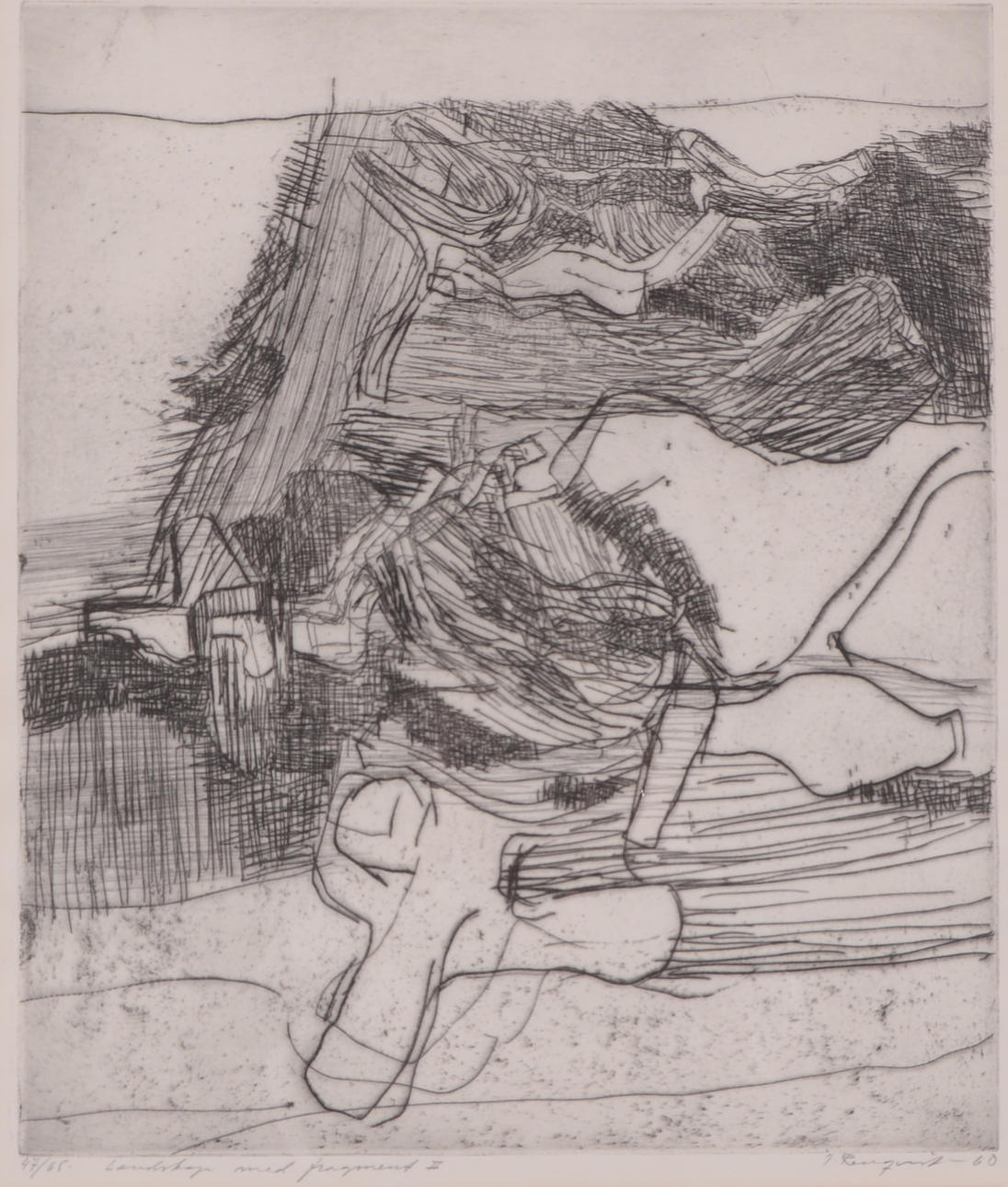 Landskap med fragment II. Signerad samt numrerad 47/65 ex. Daterad -60. 48x42 cm.