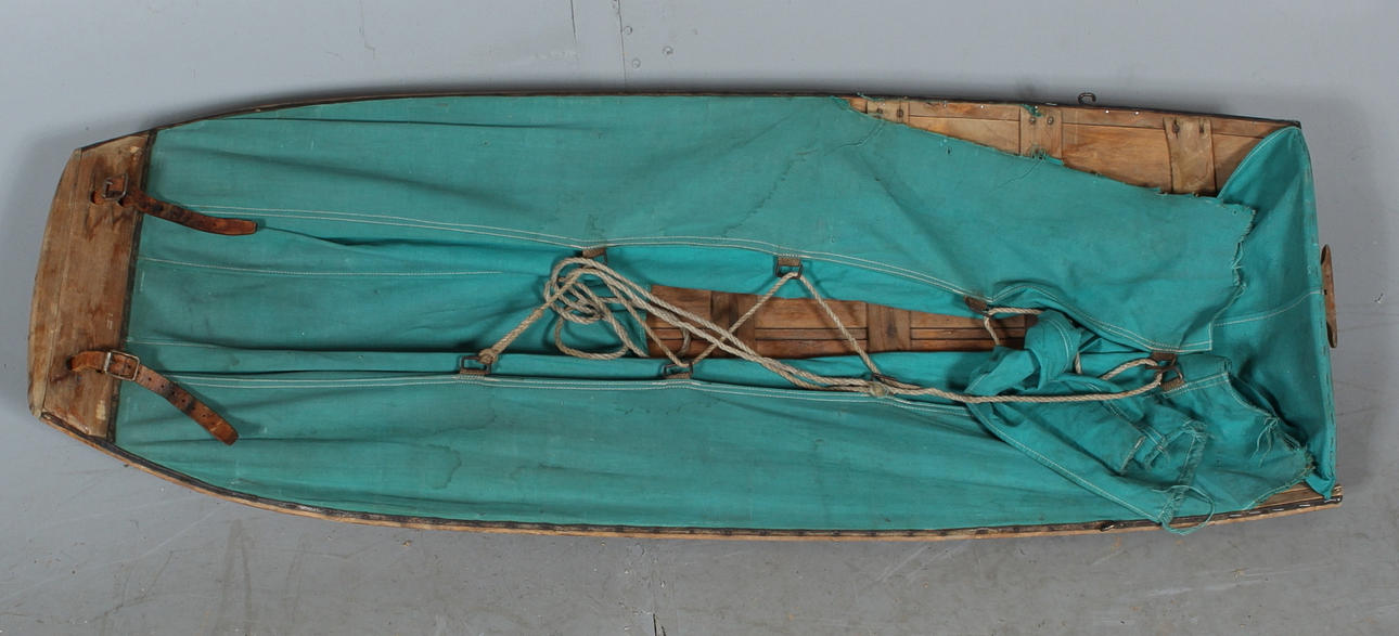 Bruksslitage, segelduk trasig, förstärkt i botten, skaklar saknas.