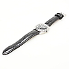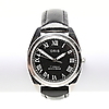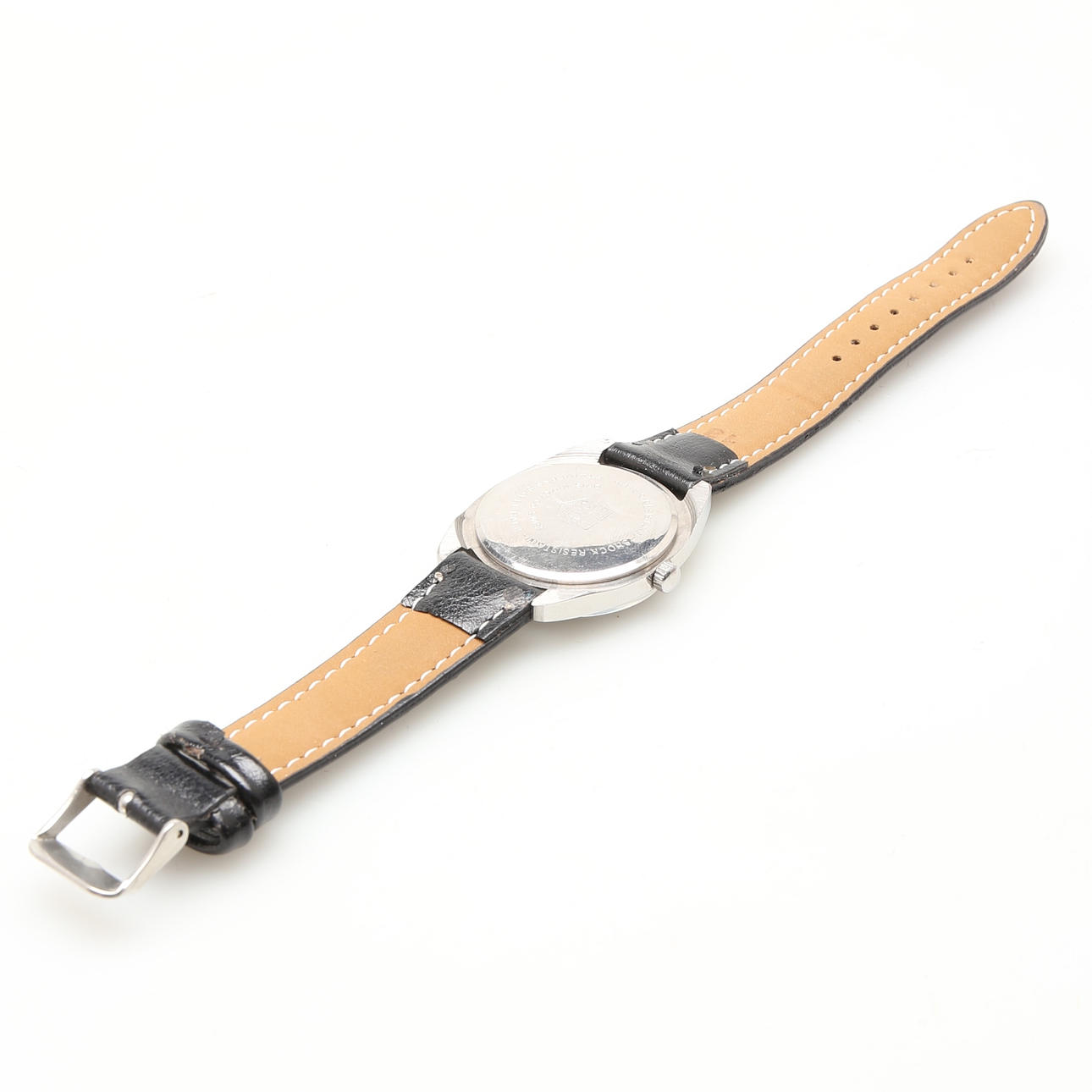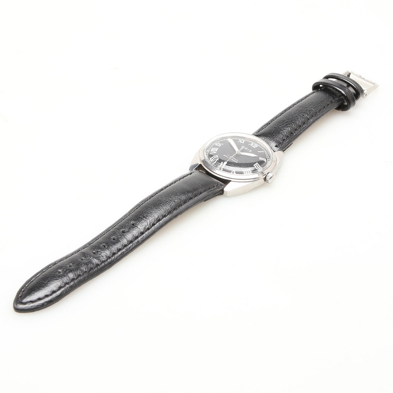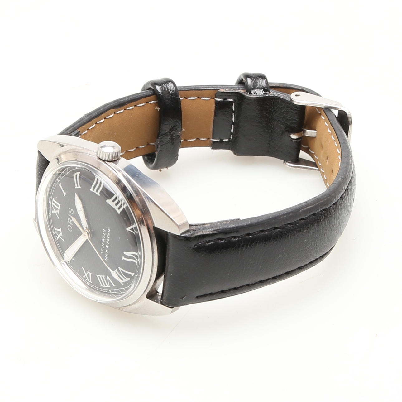 Oris armbandsur med boett i stål, svart urtavla med romerska siffror och vita visare, med självlysande timvisare. Manuellt verk. Ø 36 mm.
