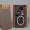 KEF Concerto golvhögtalare på hjul. Träfanerade med textilklädda frontskydd. första tillverkningsår 1969.
