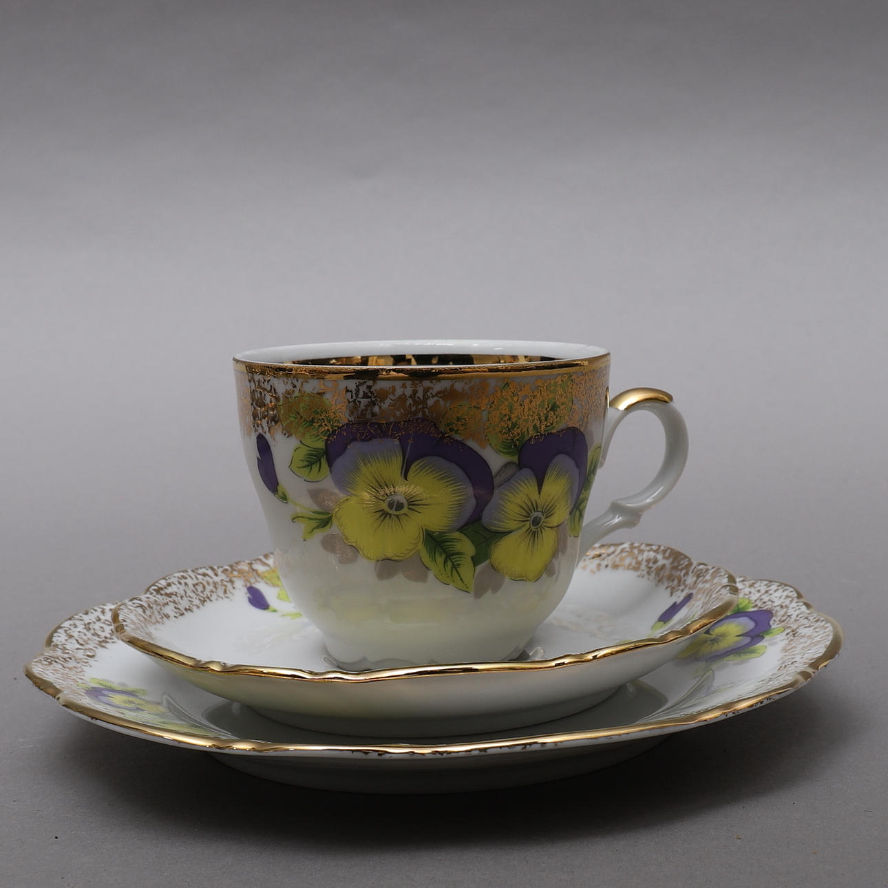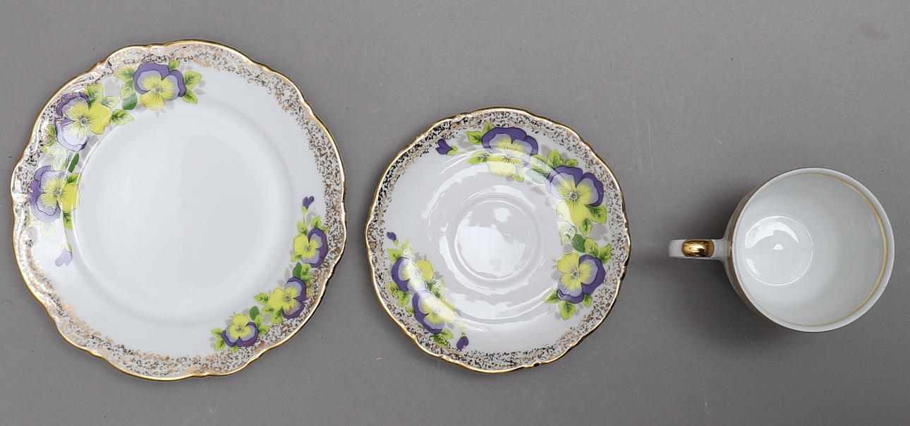 12 koppar och fat 12 assietter Violer och guldkant.