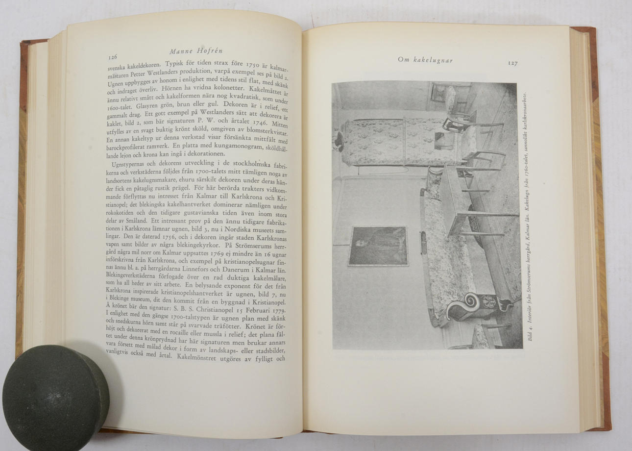 Band 1. Nummer tio Växbo; Carl von Linnés hem på Hammarby; Kyrkåka och kappsläde; Ett besök på Björkö i Österbotten; Ett stockholmshem från frihetstiden; En bys insignier och instrument; Stora daldansen och dess vapen; Om kakelugnar och kakelugnskonst i sydöstra Sverige; Hos en brudkläderska; En släktby och dess stamfader; Ett bröllop hos rågösvenskarna; Kina slott; Pehr Westman i Utanö; Garnityr; Bröllopsstugor; Korsvirkesstadens klassicism; Härkeberga; Jungfrukrans och hustruduk; Onkel Adamsmuseet i Linköping.