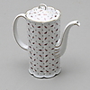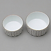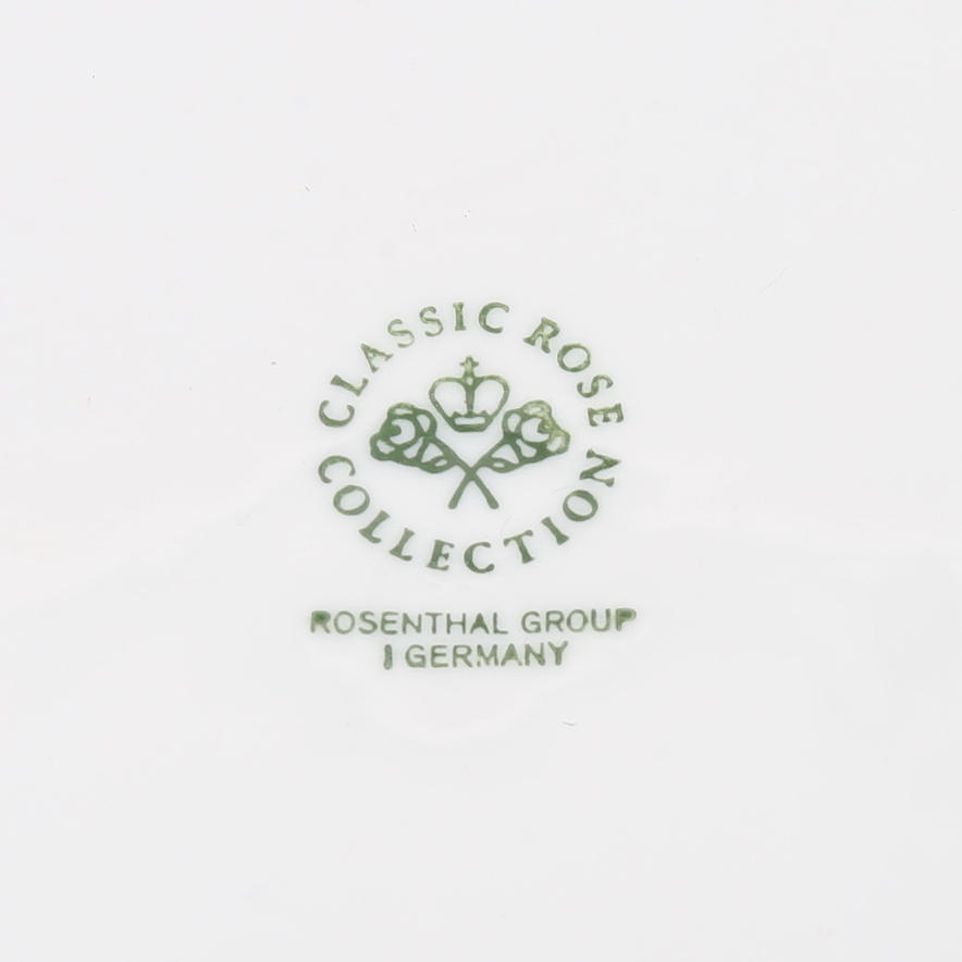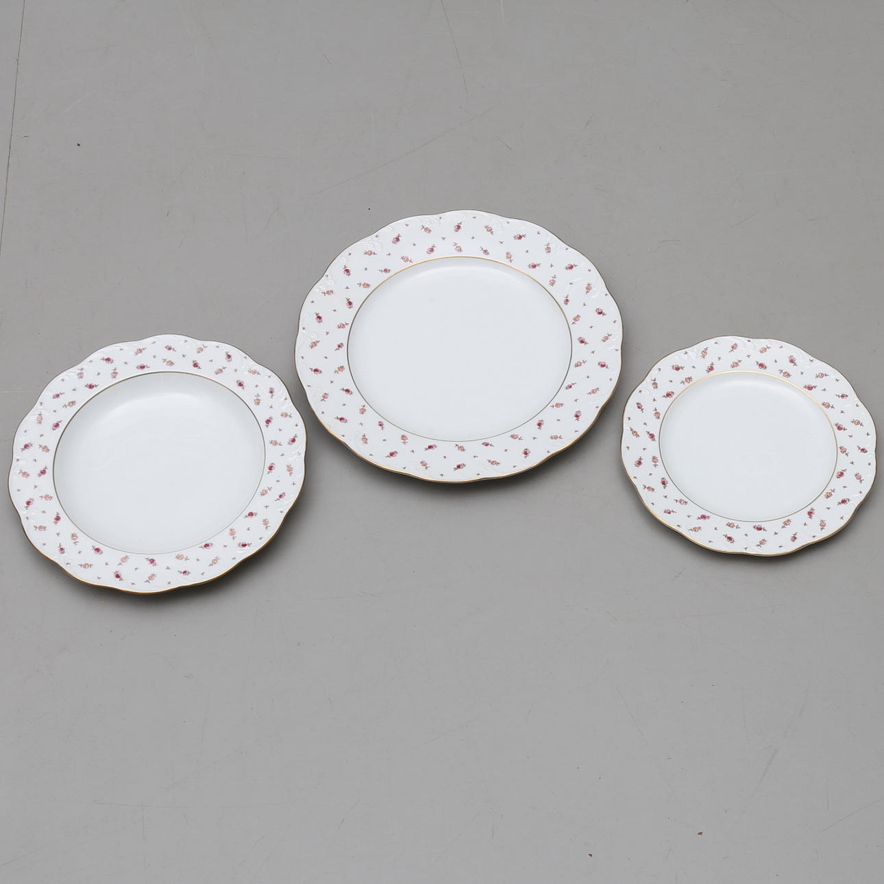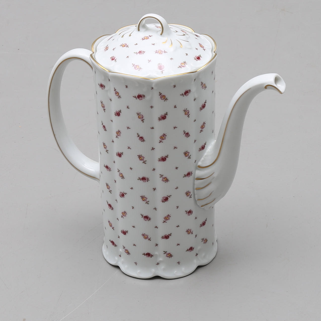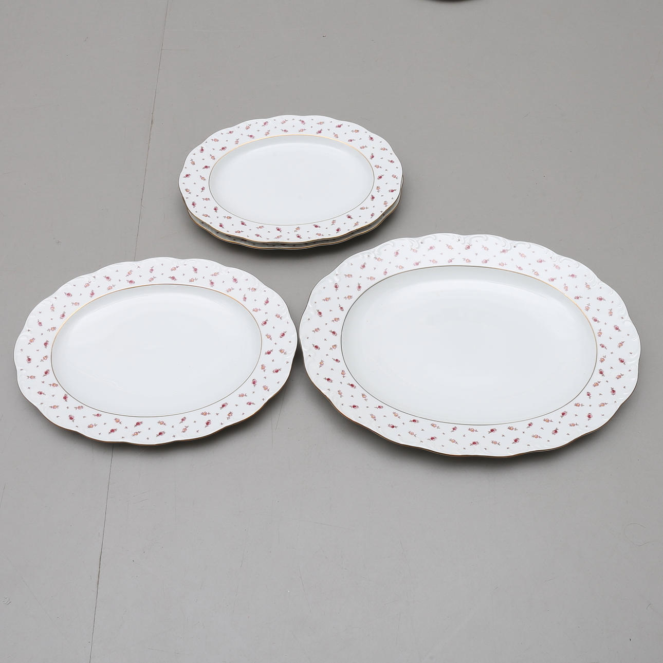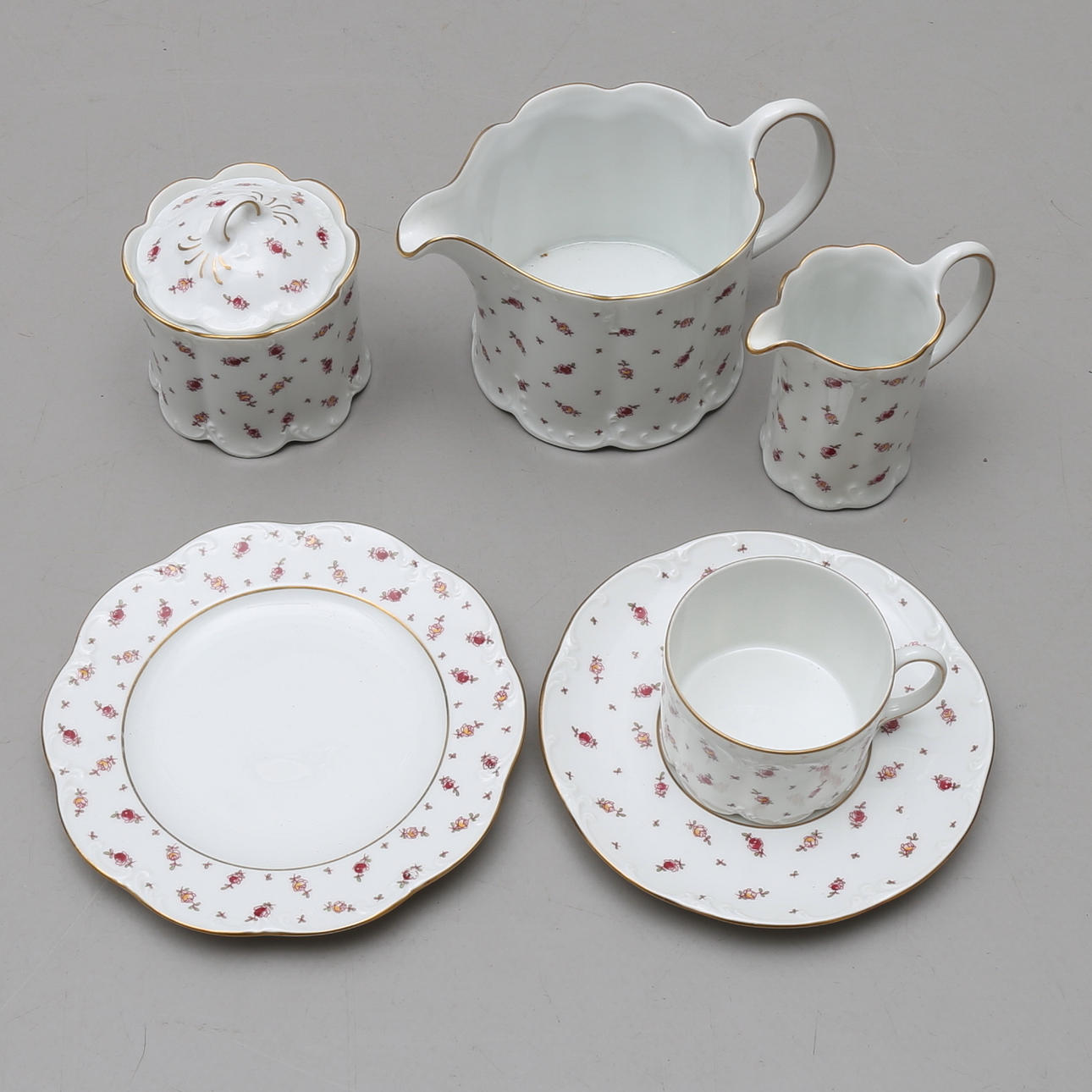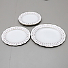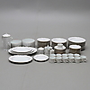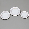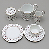 12+12 tallrikar, 12 assietter, 12 kaffekoppar med fat, 12 kakassietter, 5 uppläggningsfat, 2 skålar, såskanna, kaffekanna, gräddkanna samt sockerskål.