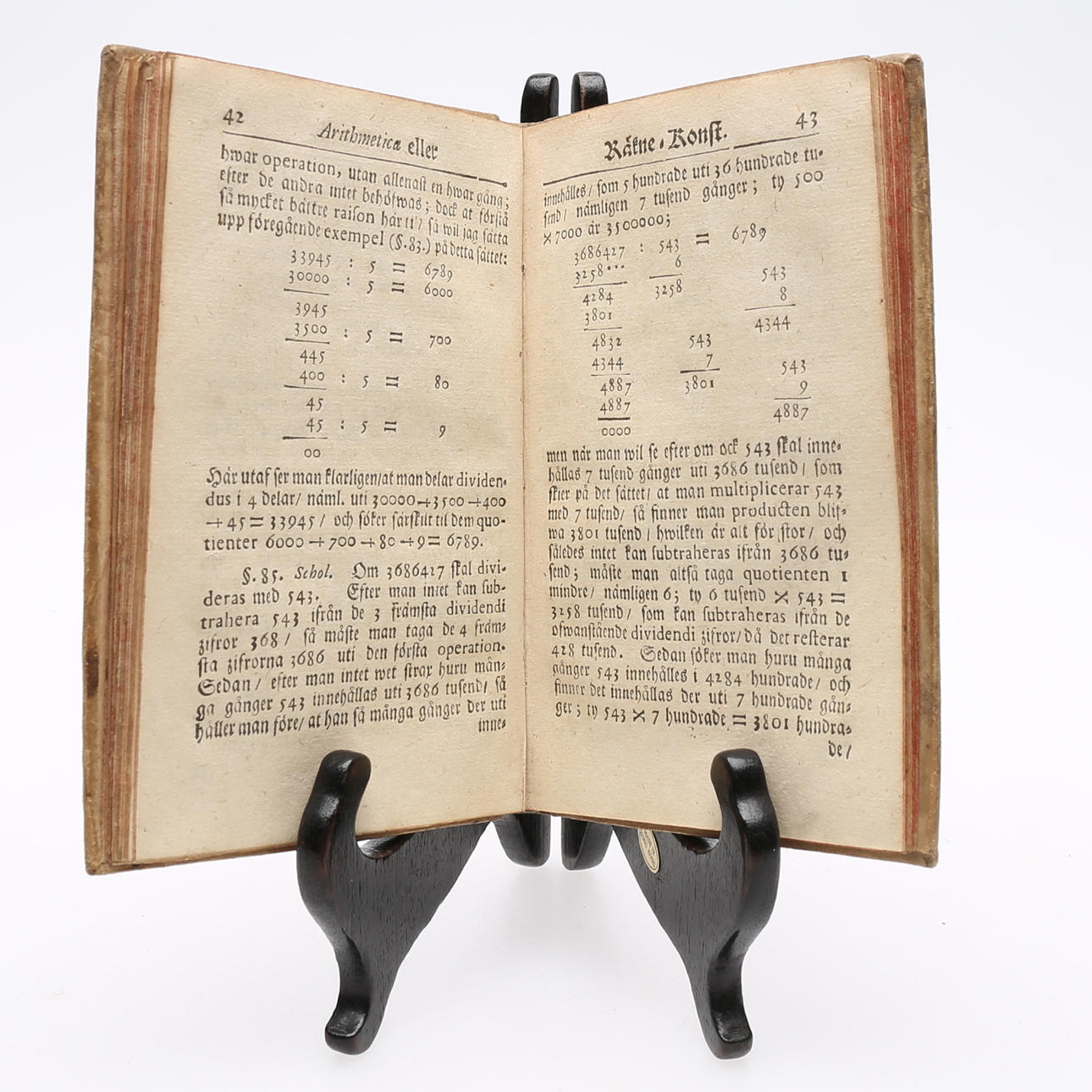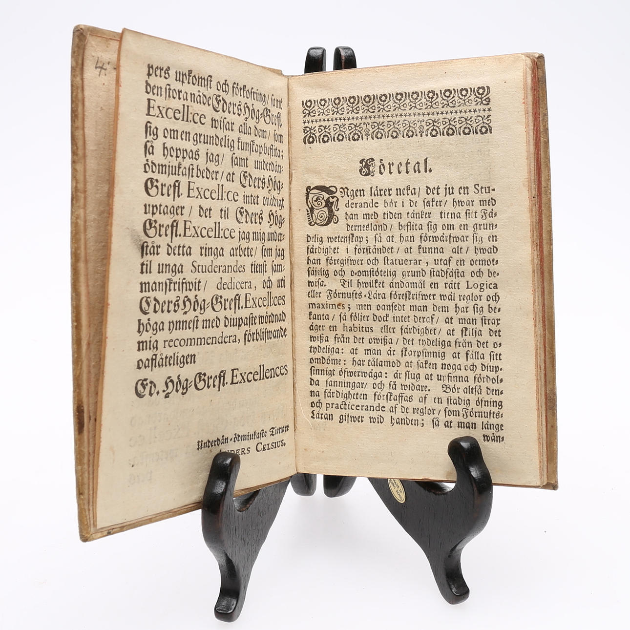 Celsius, Anders. Arithmetica Eller Räkne-Konst Grundeligen demonstrerad af Anders Celsius. Tryckt år 1727 i Upsala. Liten 8vo i ett samtida pergamentband. (VIII), 112 sid.