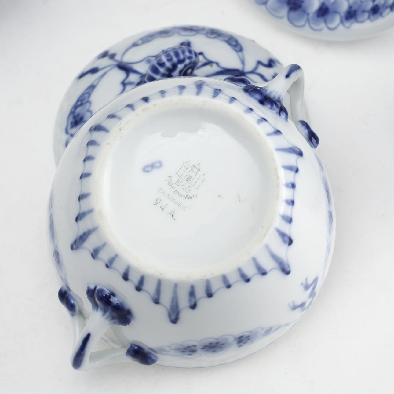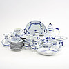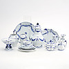 12 koppar med fat, 12 + 2 assietter, 1 kanna, 1 sockerskål, 1 gräddkanna, 2 vaser, 2 fat, 2 ljusstakar, 1 skål på fot.
