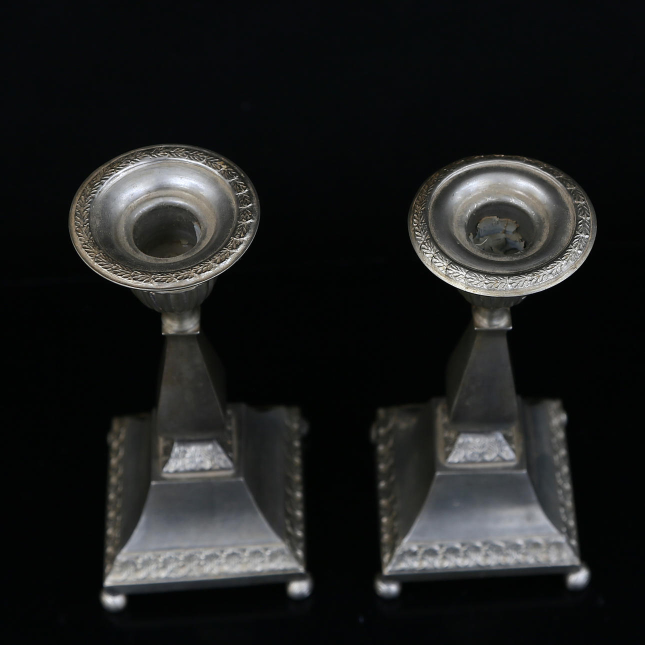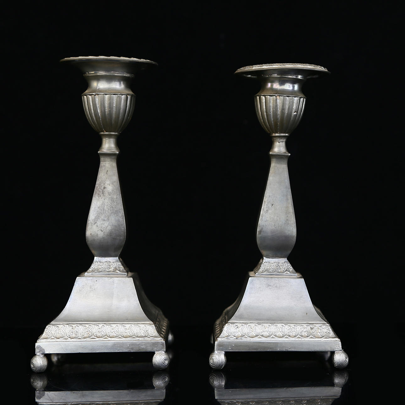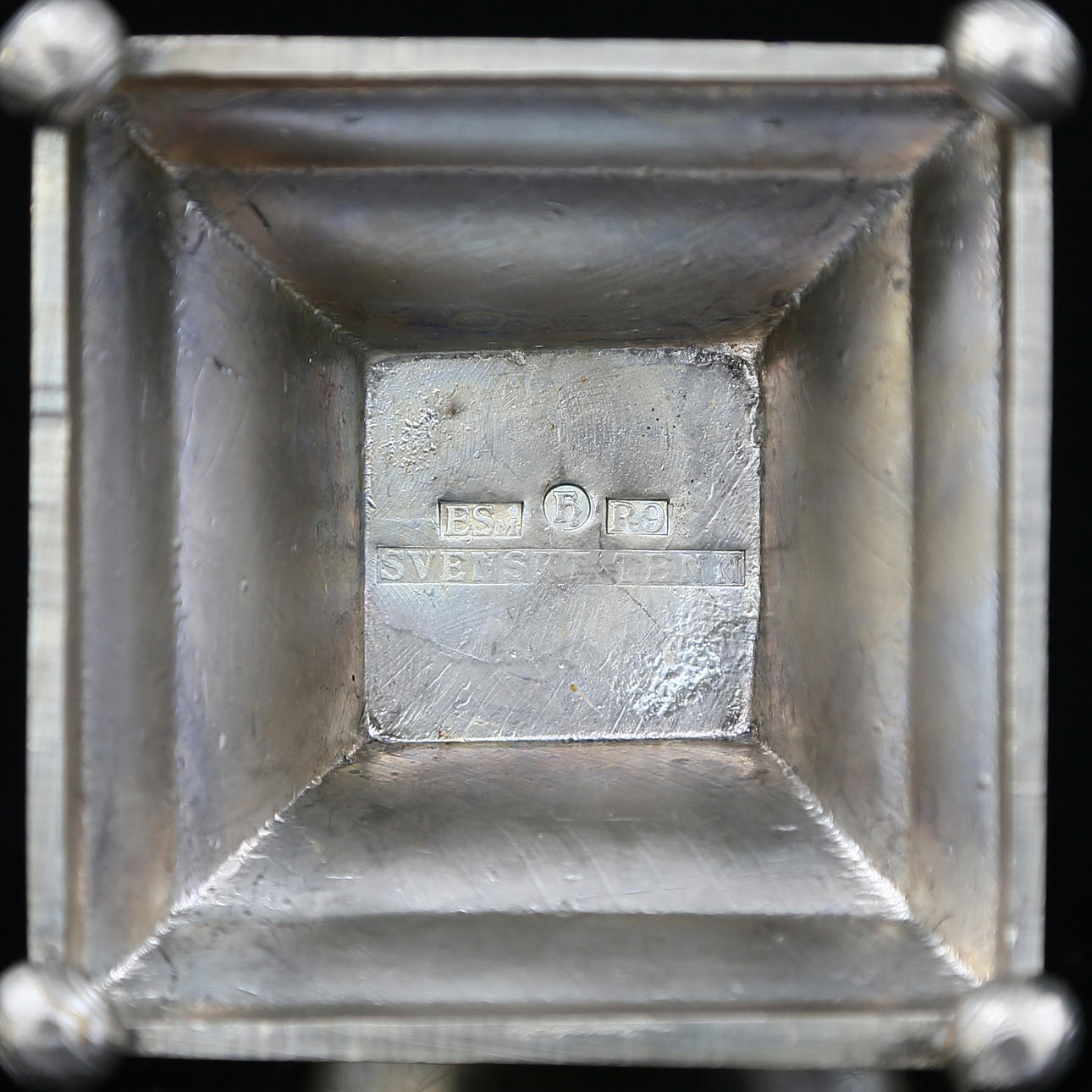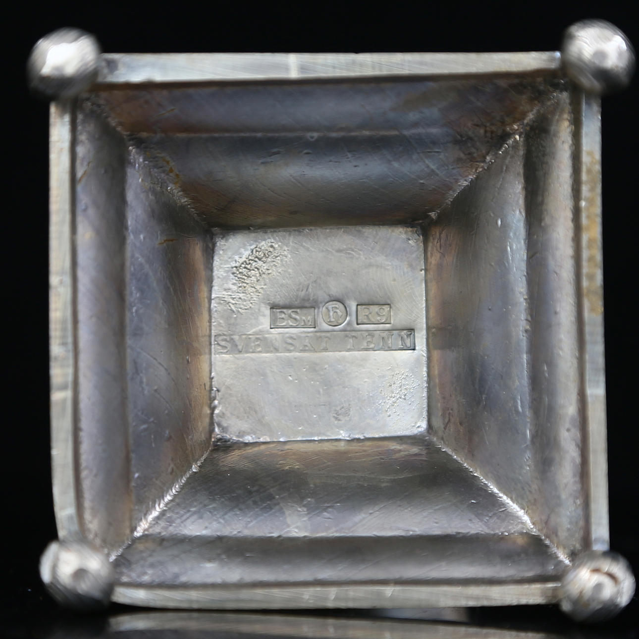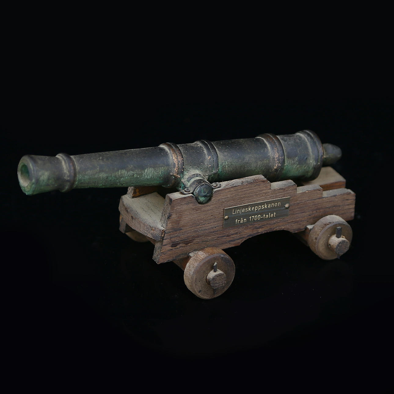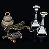 2 tennljusstakar, bordskanon (miniatyr), vällingklocka.