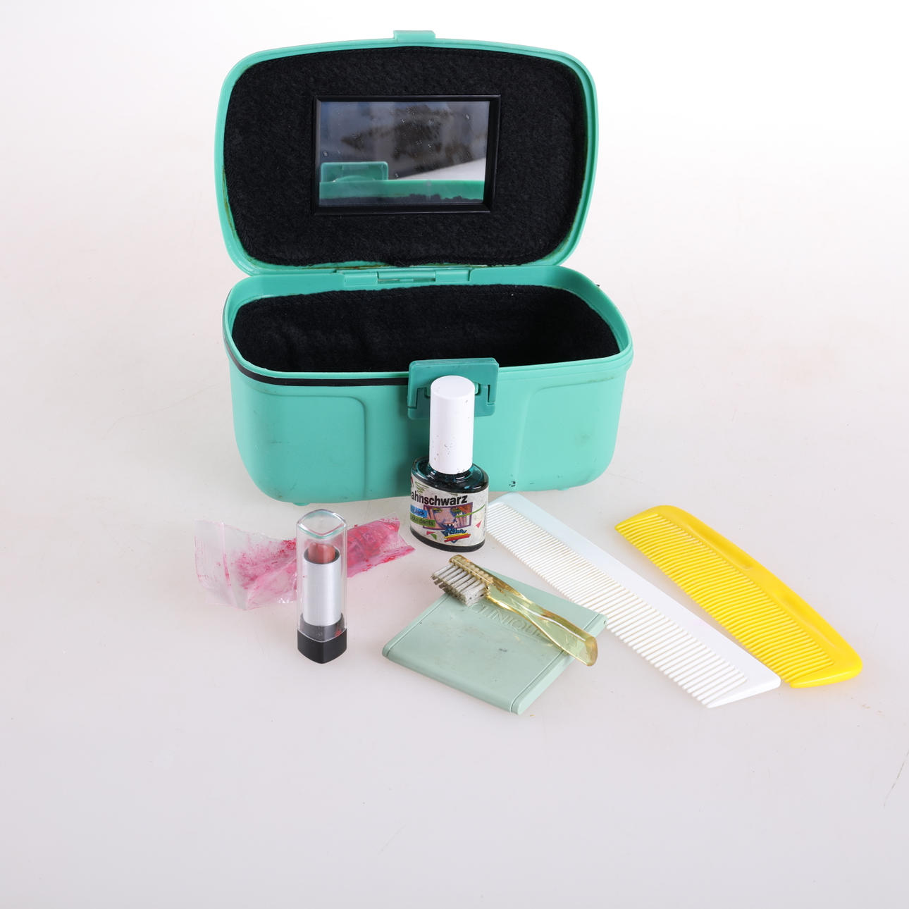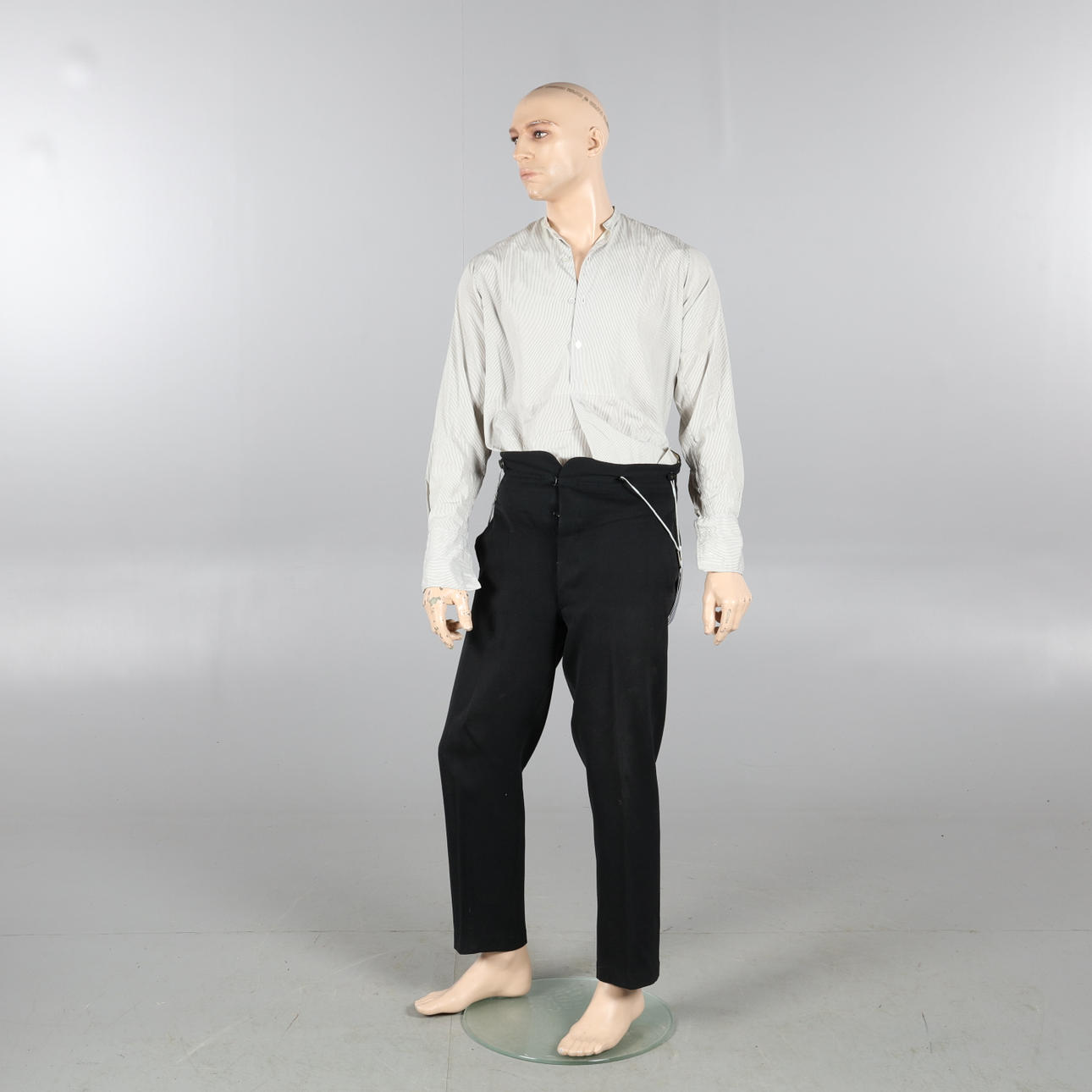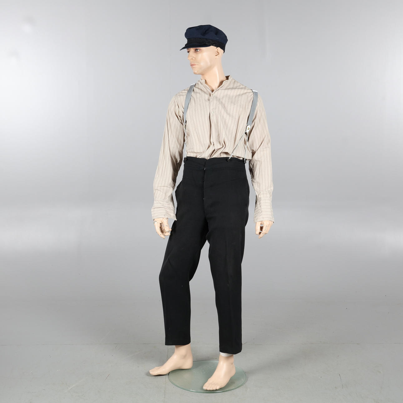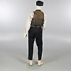 1 byxa, 2 skjortor, ett par skor, en väst, två hattar, diverse tillbehör och smink