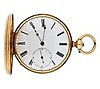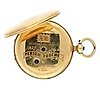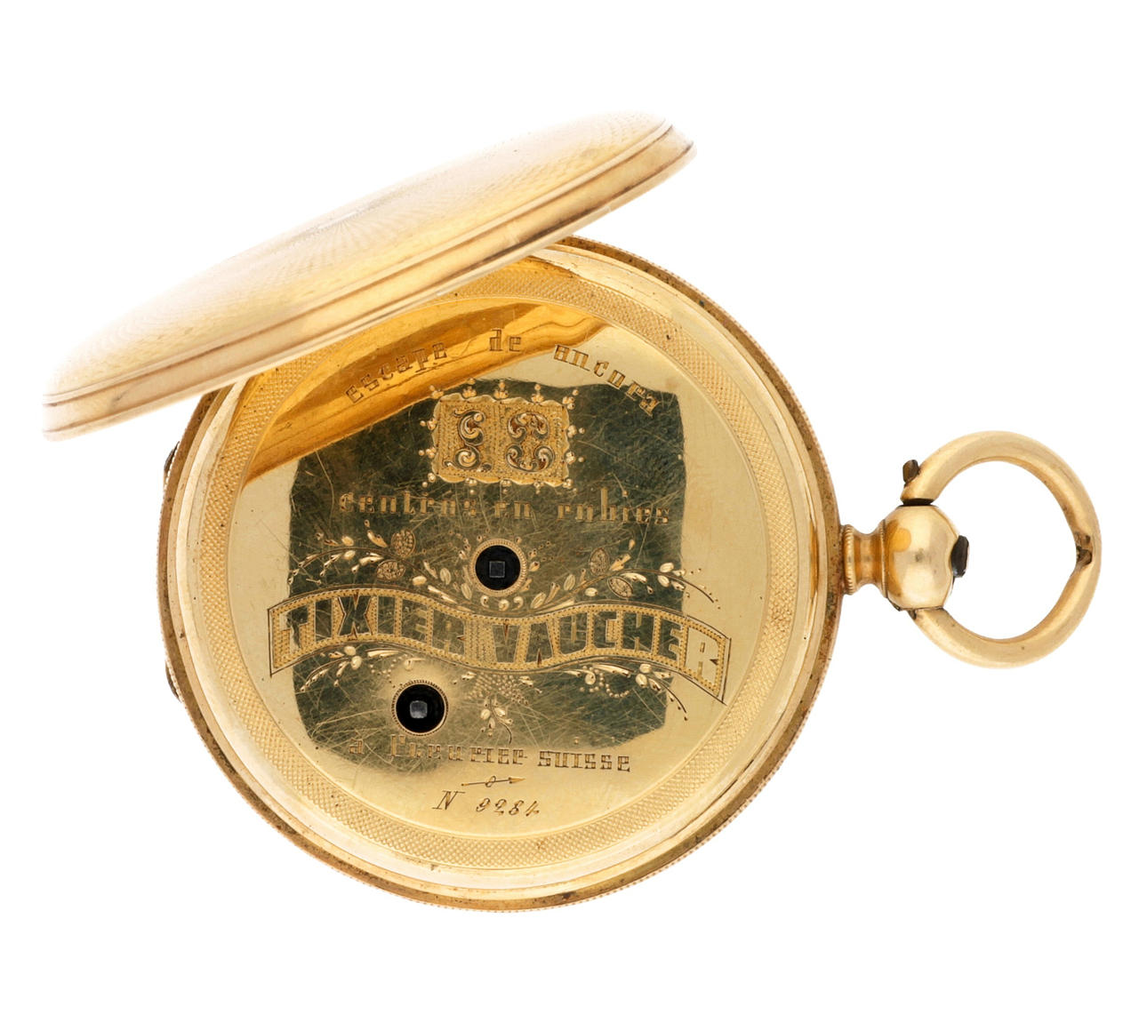 18 k guld guldväska med 47,5 mm diam.. 3 kepsar med porslinskalv. Maskin med förankringsflöde. Inredningstryck "Tixier Voucher". Svängning med en nyckel. Total vikt 77,0 gr.