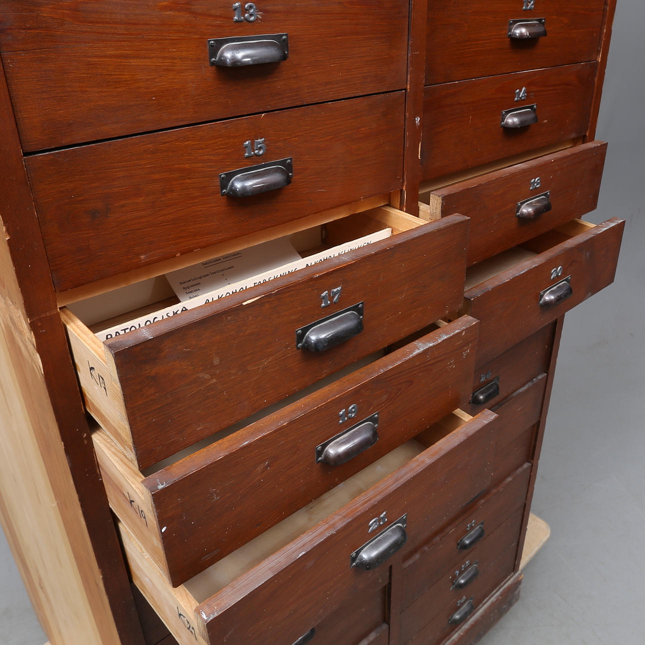 Två rader med numrerade dokumentlådor, invändigt med avdelare. Längd ca 77 cm Djup ca 66 cm Höjd ca 199 cm.