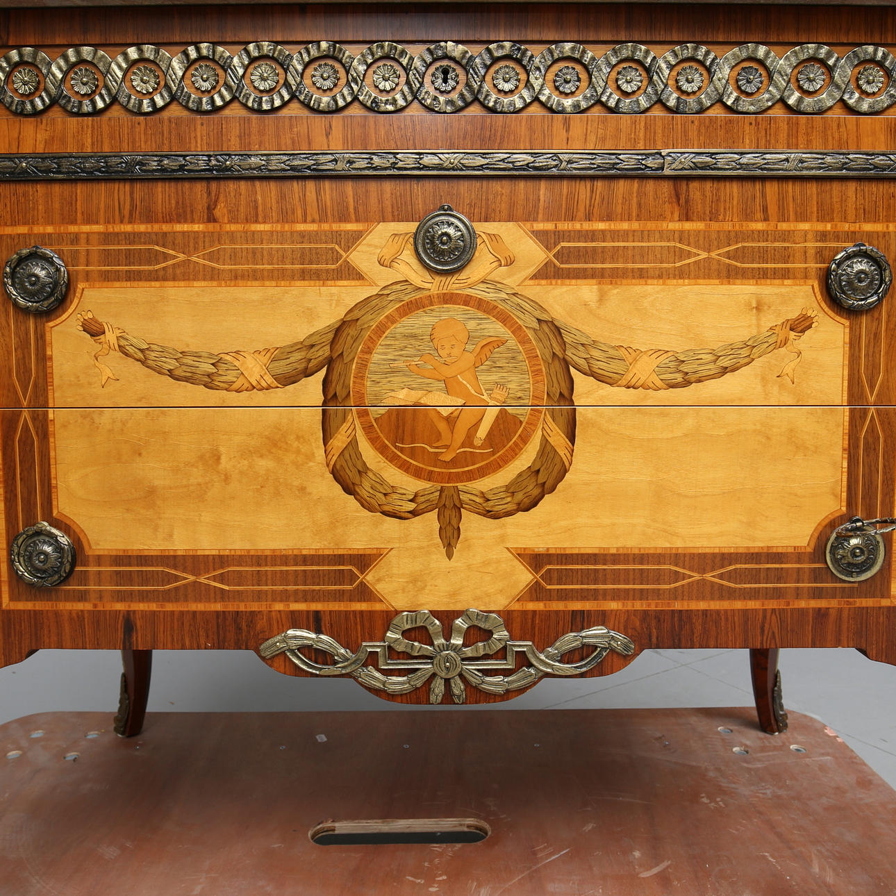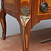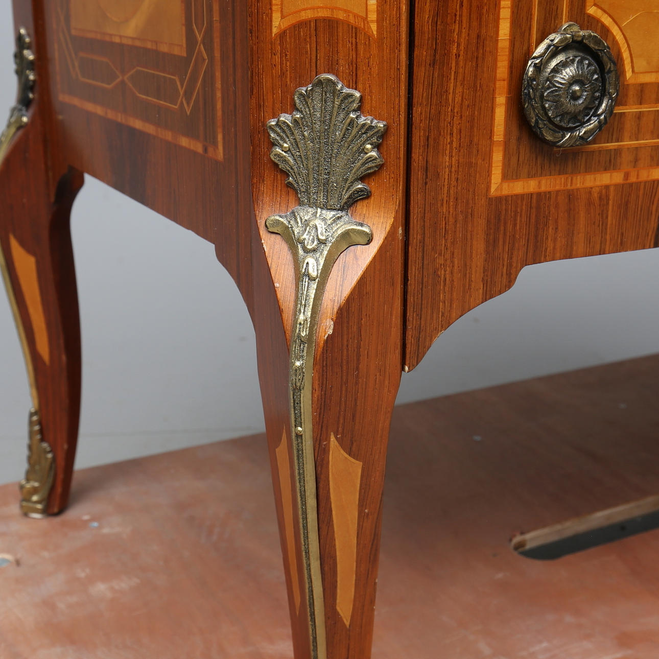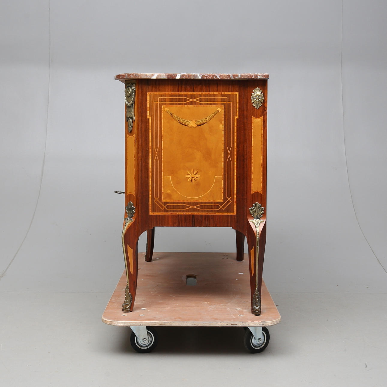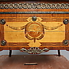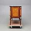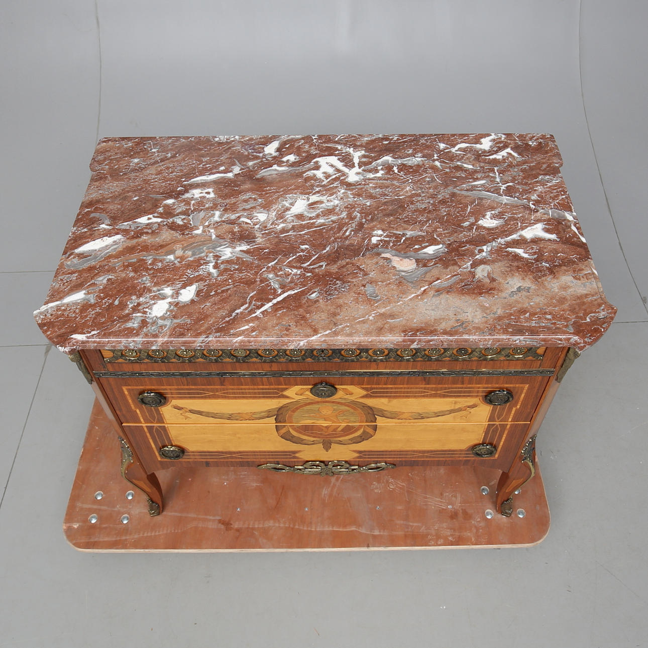 Rik intarsiadekor samt mässingsbeslag. Med stenskiva. Längd 95 cm, bredd 52 cm, höjd 82 cm.