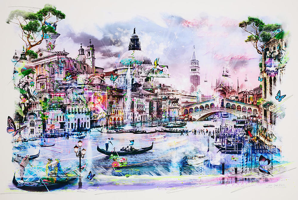 Klibansky’s work is rooted in the modern metropolis, often depicting surreal, dreamlike cityscapes that blend past, present, and future. Using hundreds of digitally layered images combined with acrylic paint and graphic techniques, he constructs vibrant, dynamic worlds that challenge the viewer’s sense of reality. His signature style—bright, saturated colors and a fusion of utopian and dystopian elements—reflects his fascination with the complexities of urban life and the possibilities of digital art.