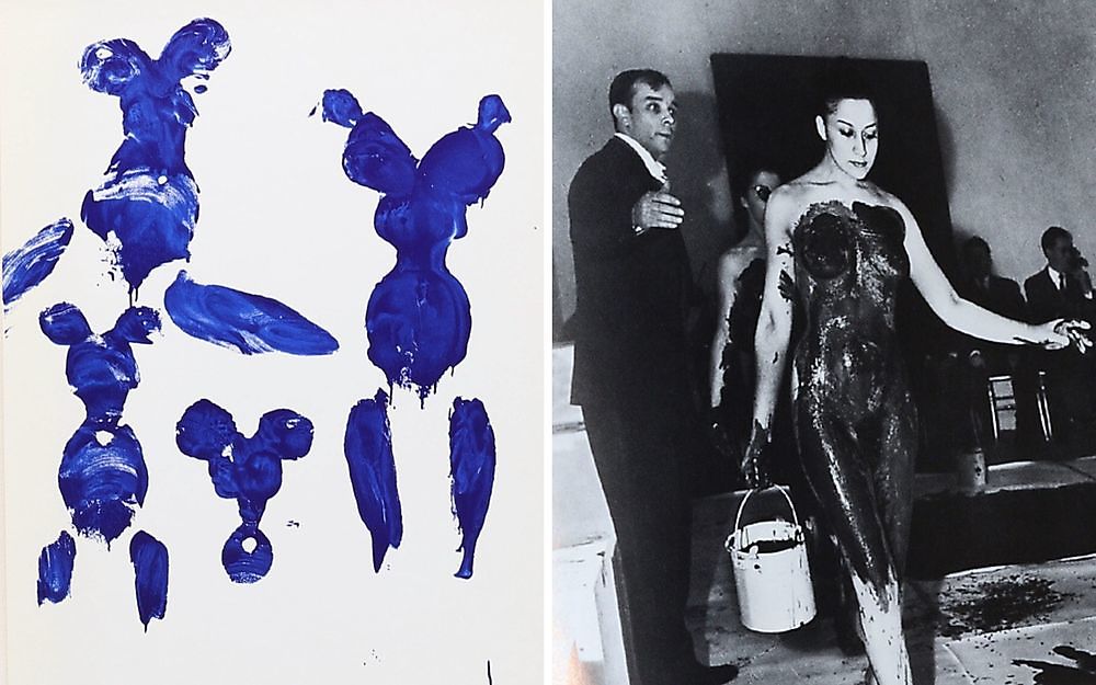 Vidare experimenterade Klein med performance och kropp som redskap, mest känt för serien Anthropométries där nakna modeller doppades i blå färg och användes som levande penslar för att trycka sina kroppar mot dukar.