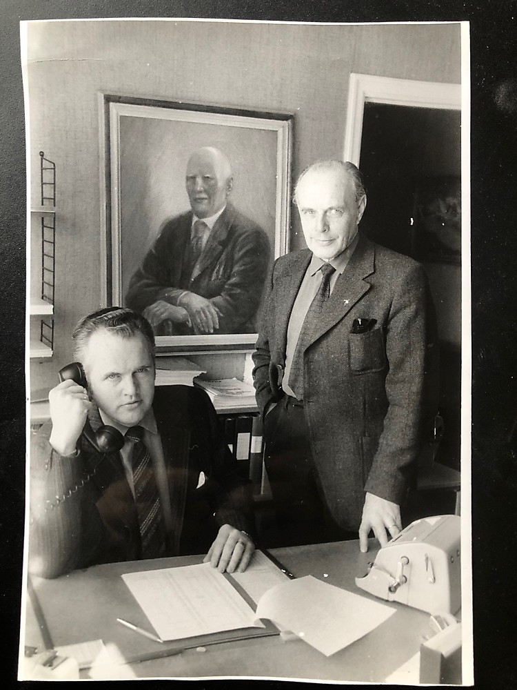 Auktionisterna, tillika far och son, Berndt & Göran Engström. Vakar över dem från sitt porträtt gör deras far och farfar, auktionsfirmans grundare, Arwid Engström. Första, andra och tredje generationens auktionsförrättare.