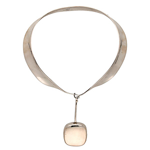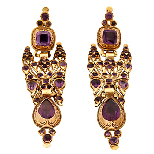 "Från smyckesavdelningen kan jag presentera tre historiska smycken som på sitt eget sätt visar hur smycken har utvecklats över tid. De skiljer sig alla i stil men har två saker gemensamt, elegans och kvalitet. Först ut är ett par katalanska örhängen från 1800-talet i guld med ametister. Vivianna Torun Bülow-Hübes eleganta halssmycken är hett eftertraktade på auktioner idag och här ser ni modell 160 från omkring 1968. Som tredje smycke hittar ni Lluís Masriera Rosés fantastiska jugendskapelse från omkring 1908."